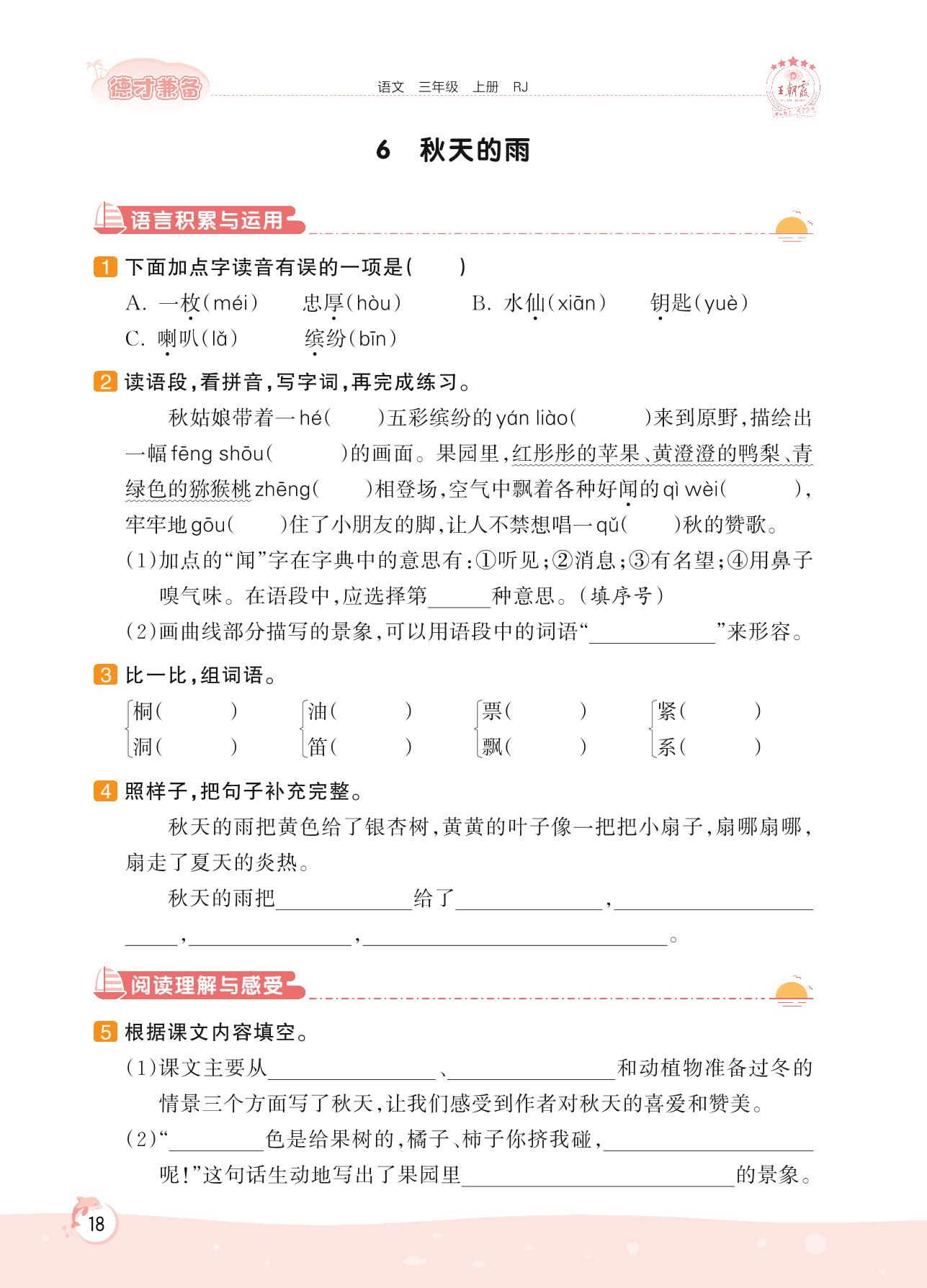 2022上册三年级语文人教版 第二单元 金秋时节——6 秋天的雨