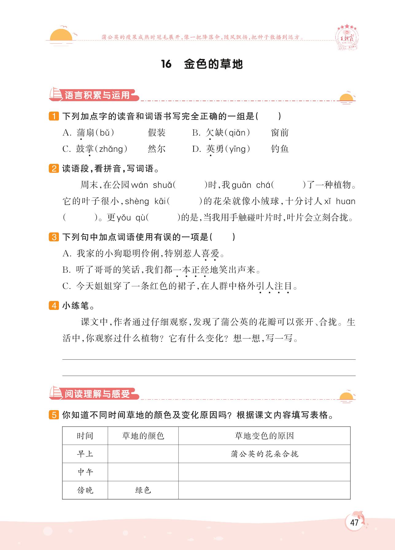 2022上册三年级语文人教版 第五单元 留心观察——16 金色的草地