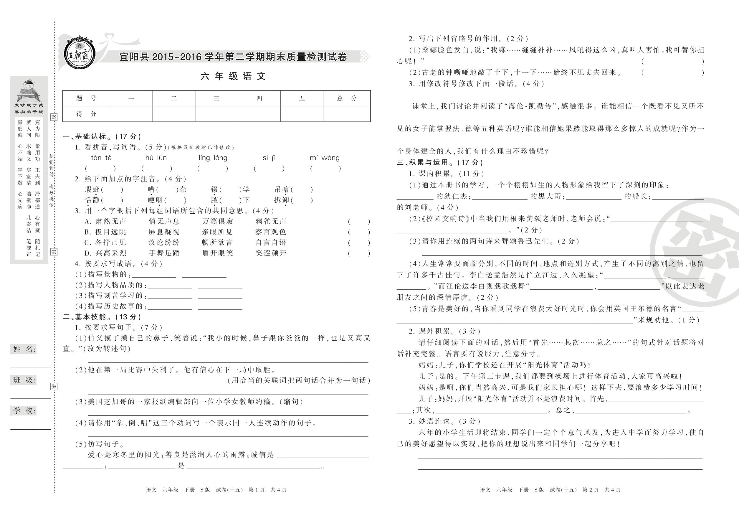 2015-2016学年第二学期洛阳市宜阳县六年级语文试卷(S版)【15】