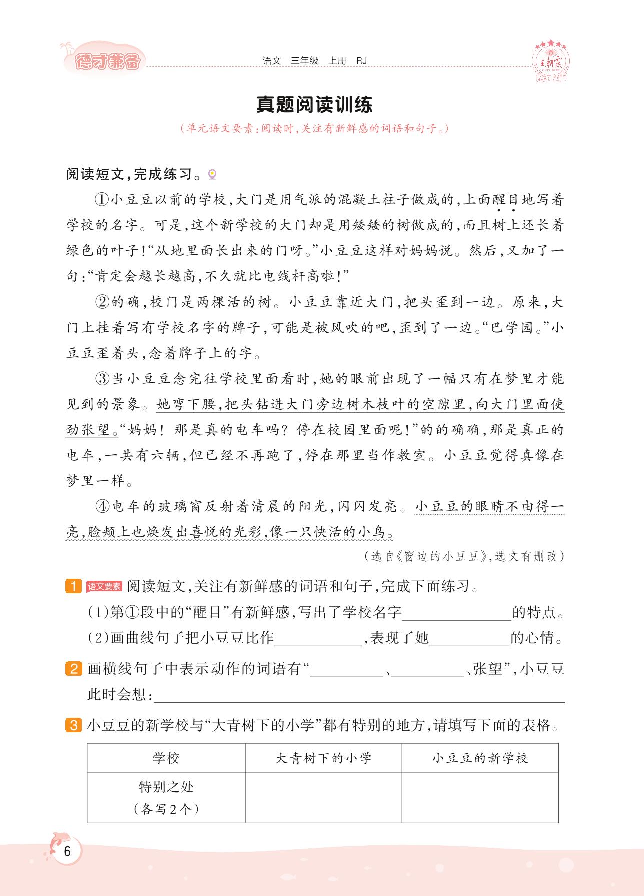 2022上册三年级语文人教版 第一单元 学校生活——真题阅读训练(阅读提升)
