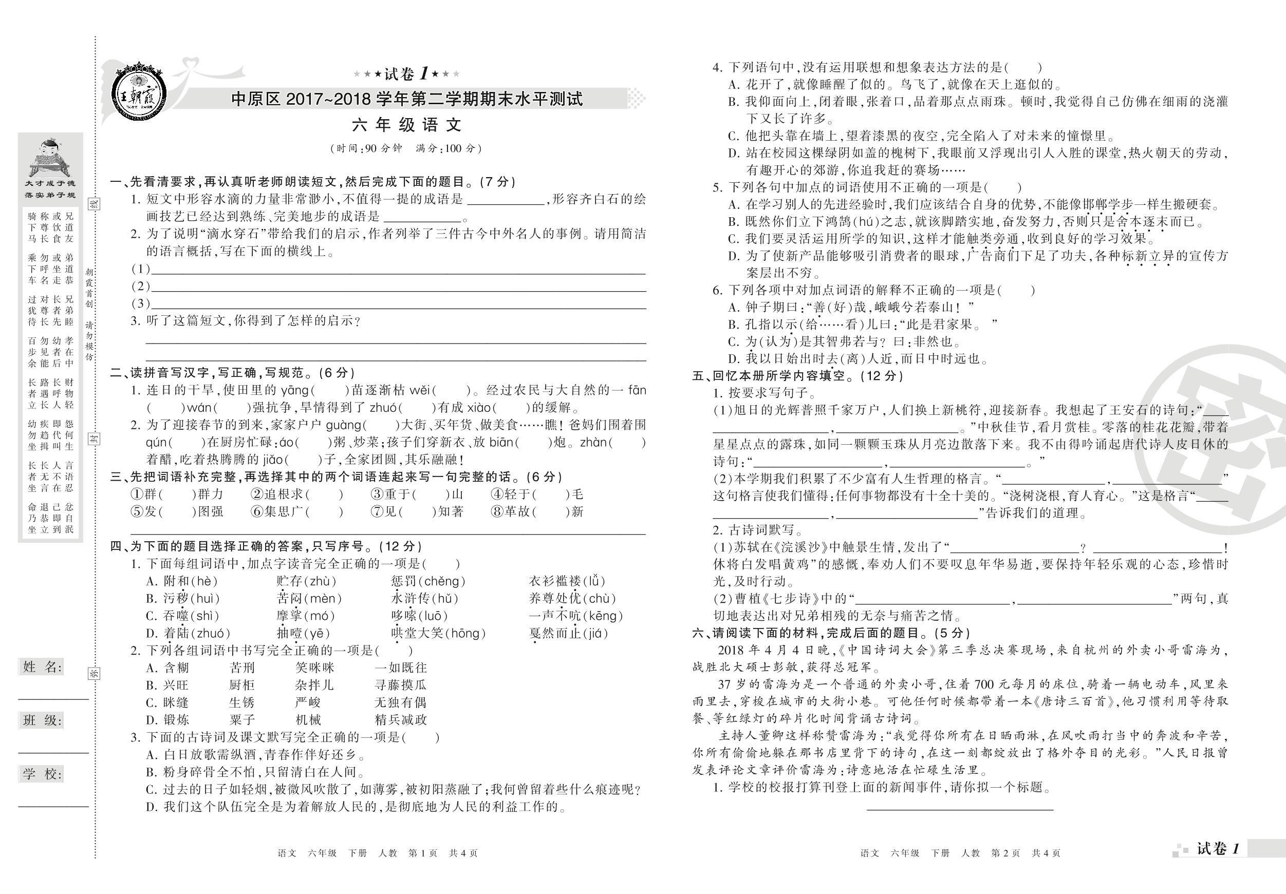 2017-2018学年第二学期郑州市中原区六年级语文试卷(人教版)_R21080253526【1】