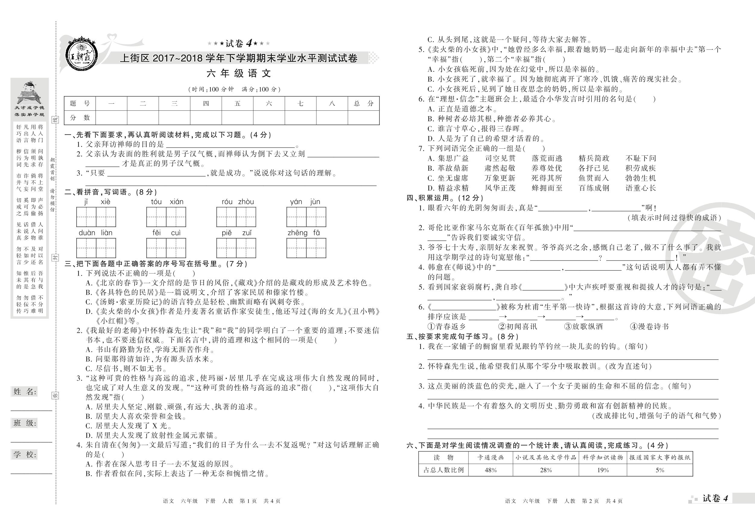 2017-2018学年第二学期郑州市上街区六年级语文试卷(人教版)【4】