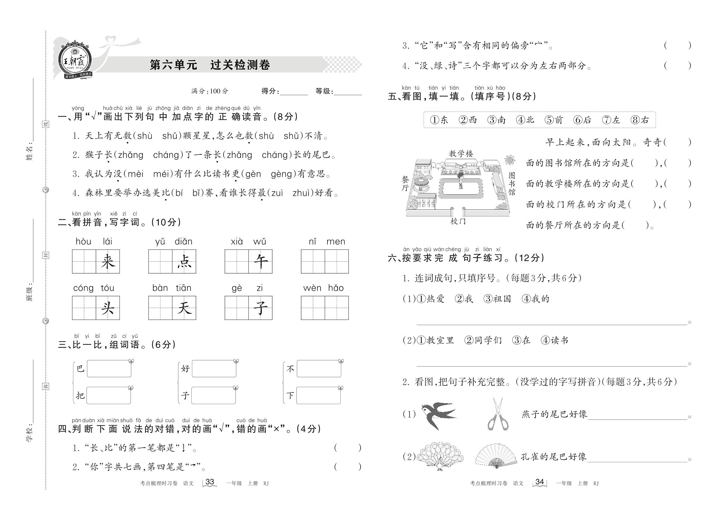 2022上册一年级语文人教版 第六单元 过关检测卷