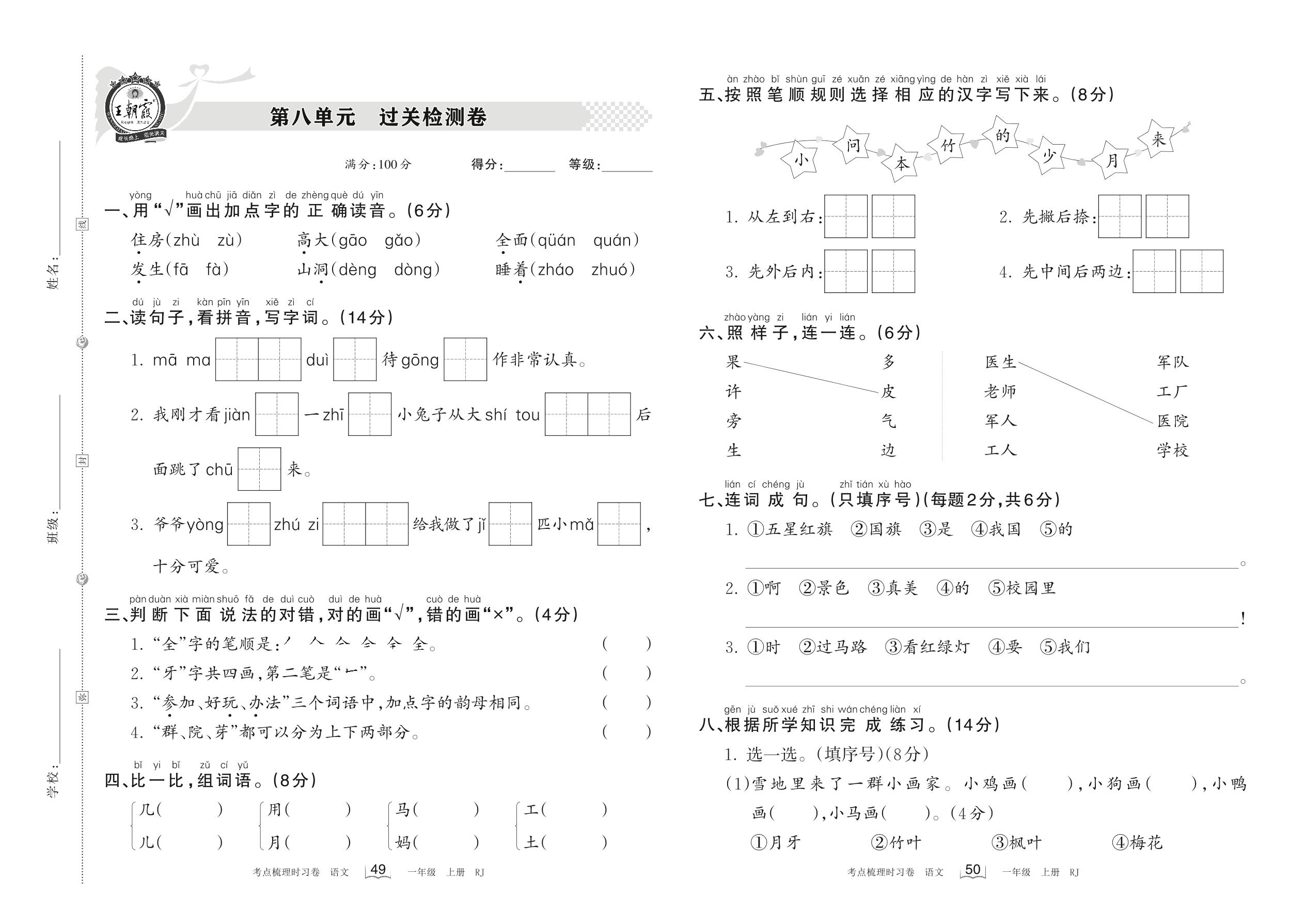 2022上册一年级语文人教版 第八单元 过关检测卷