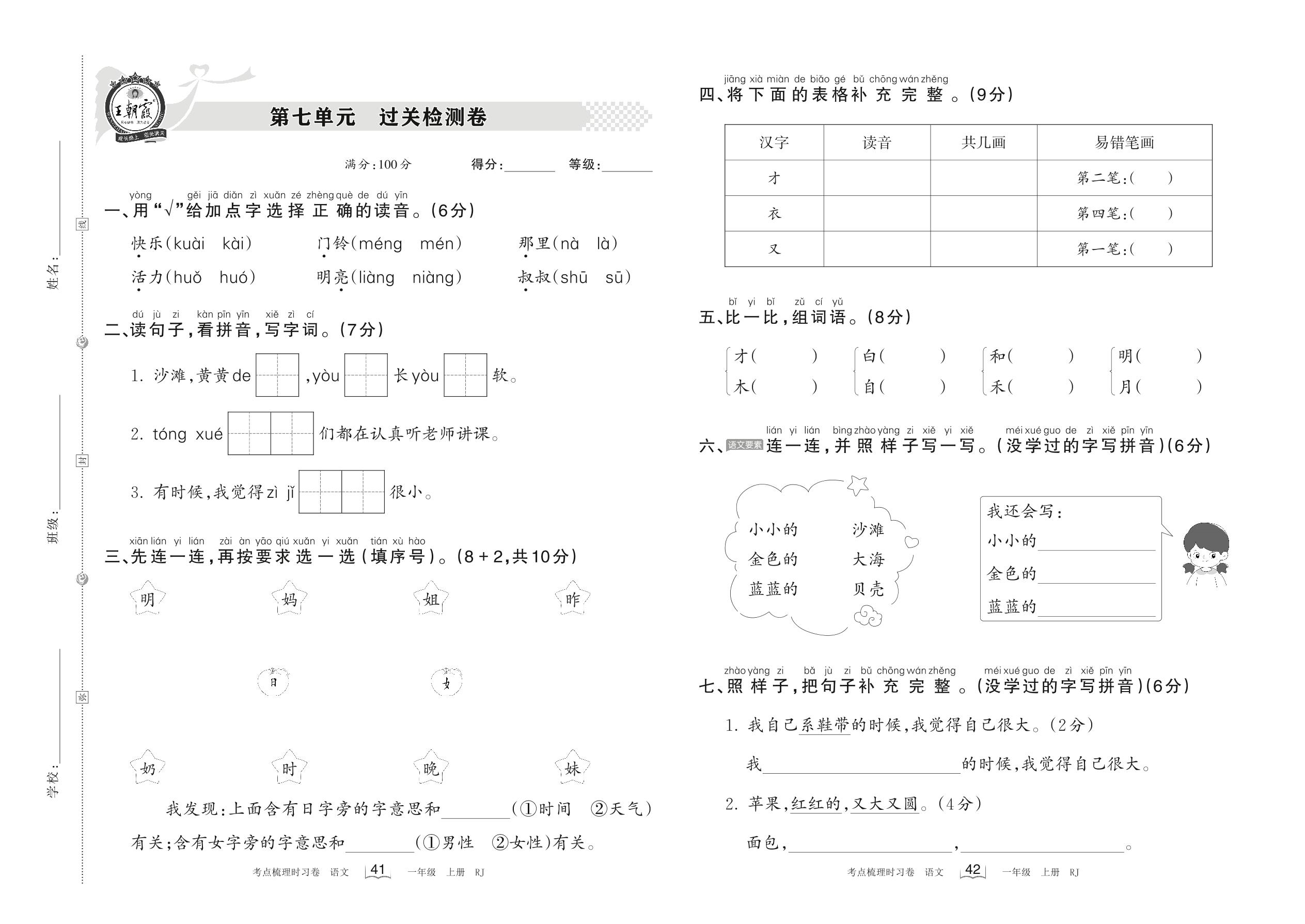 2022上册一年级语文人教版 第七单元 过关检测卷