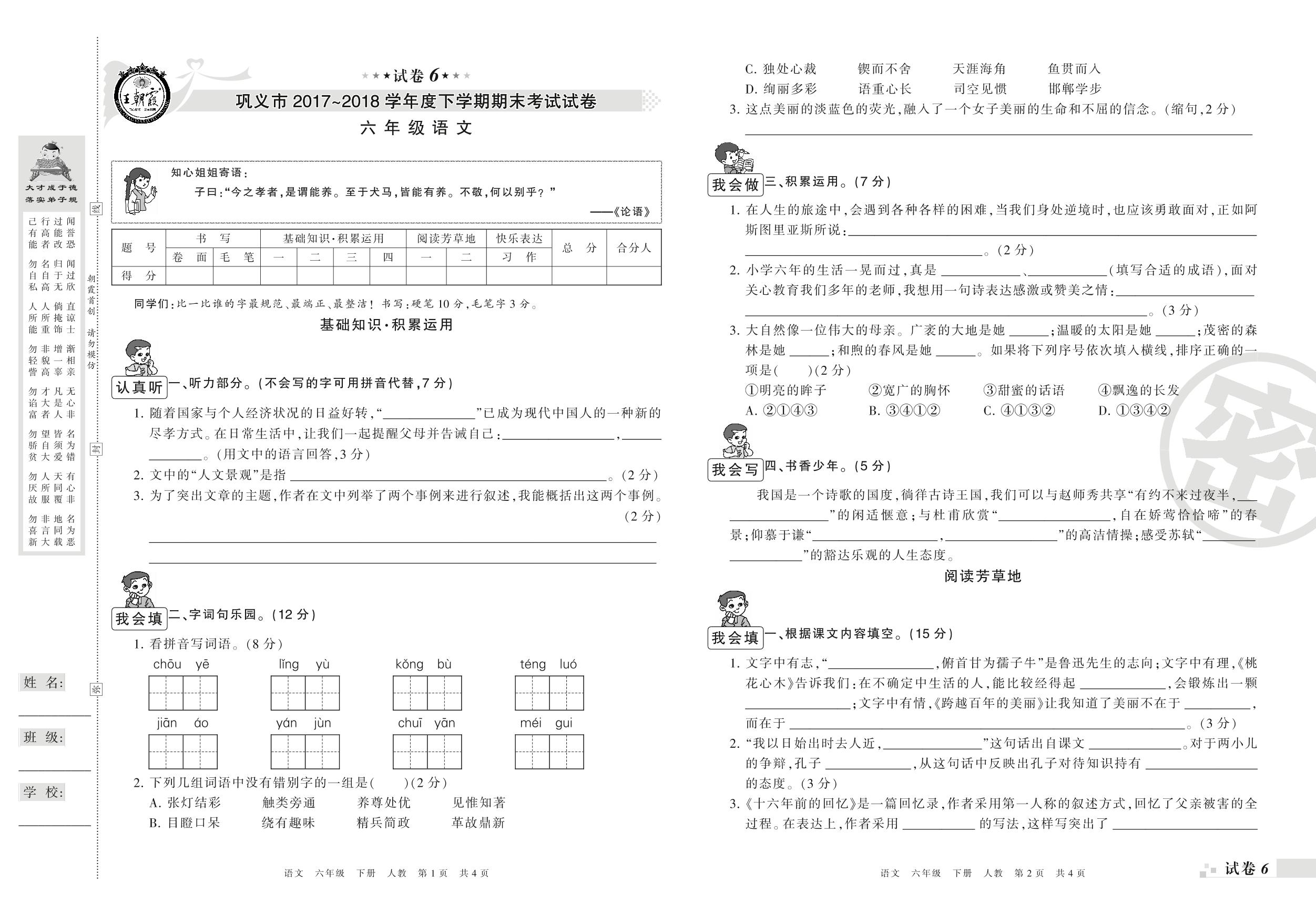 2017-2018学年第二学期巩义市六年级语文试卷(人教版)【6】