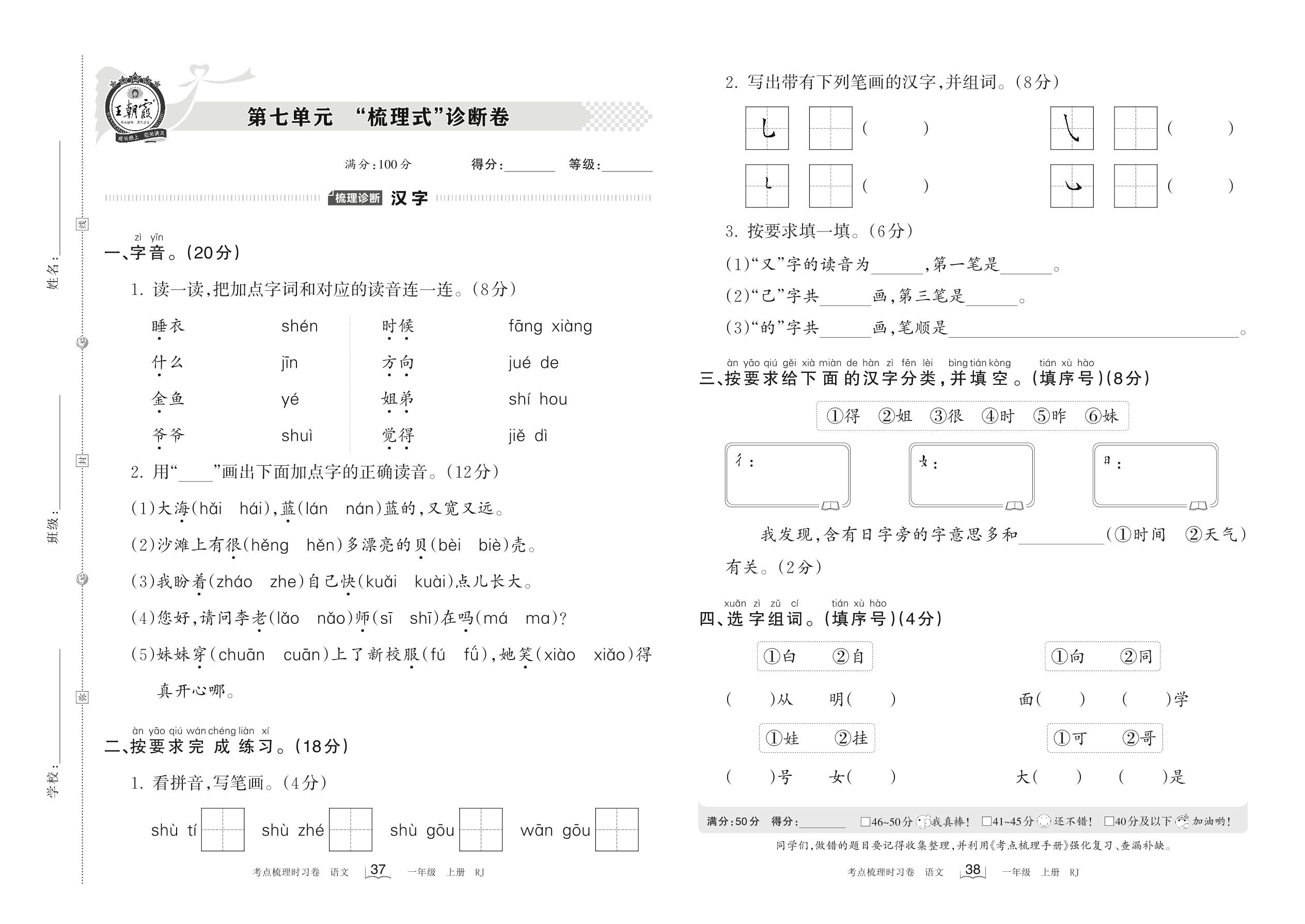 2022上册一年级语文人教版 第七单元 “梳理式”诊断卷