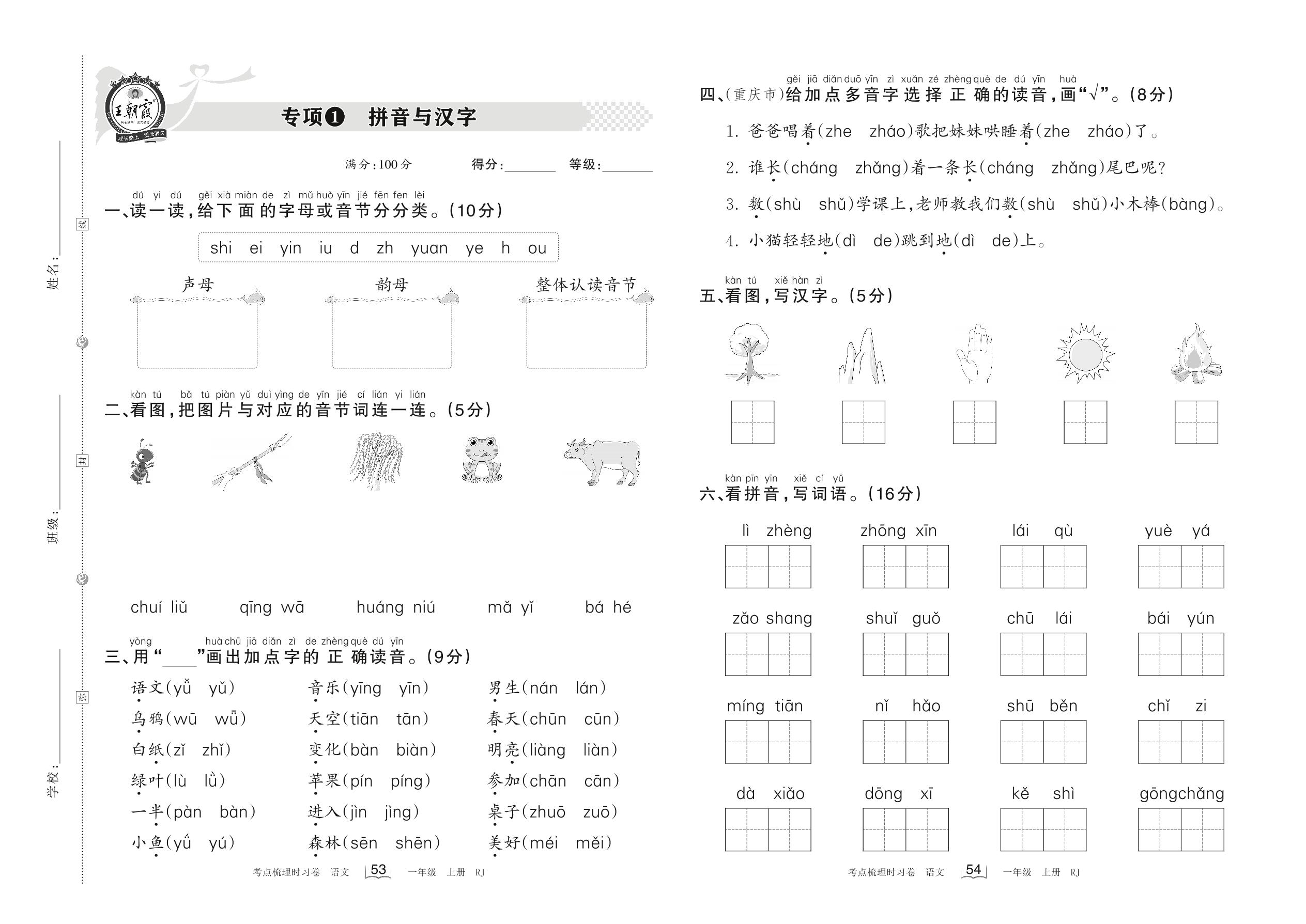 2022上册一年级语文人教版 专项1 拼音与汉字