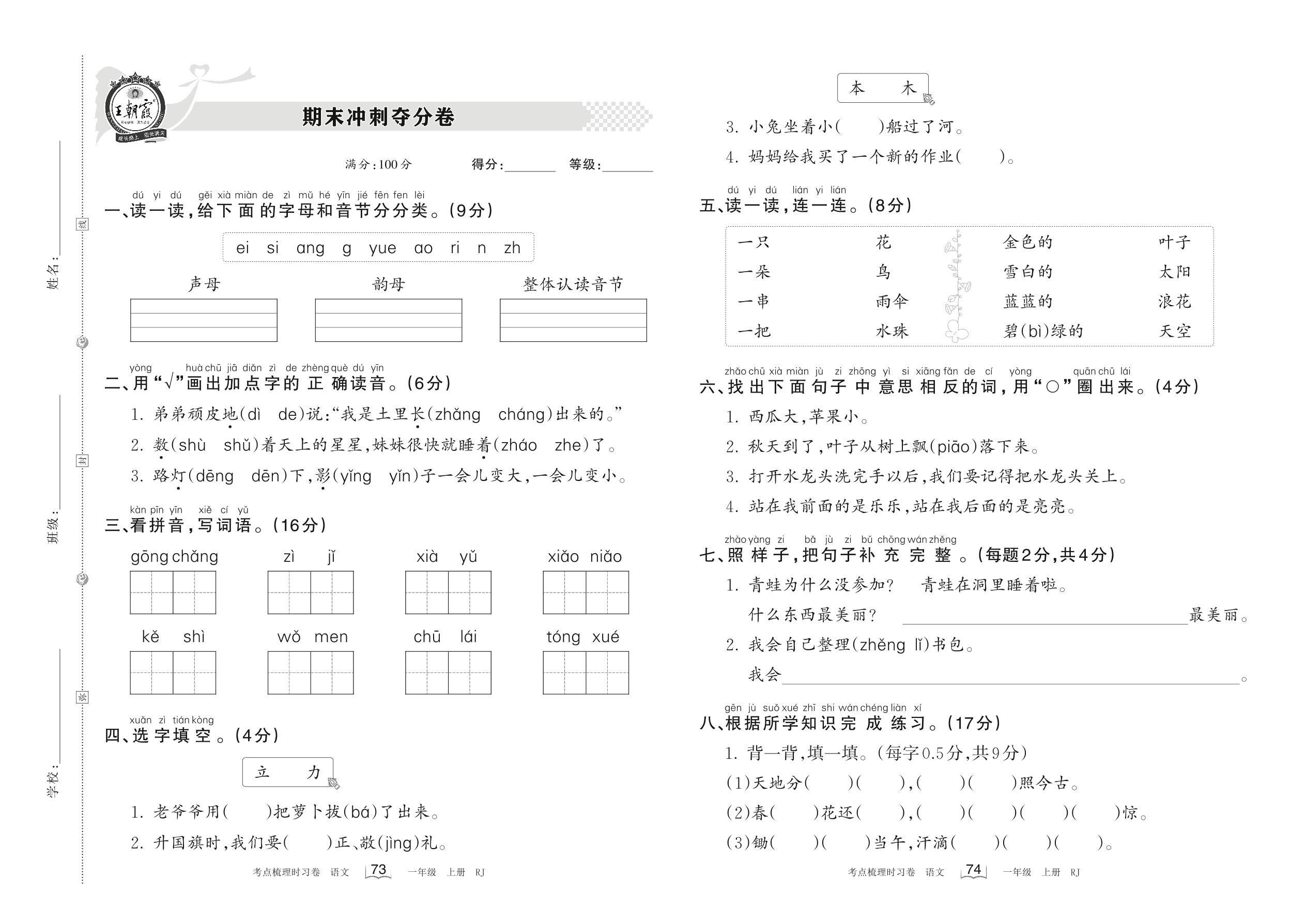 2022上册一年级语文人教版 期末冲刺夺分卷