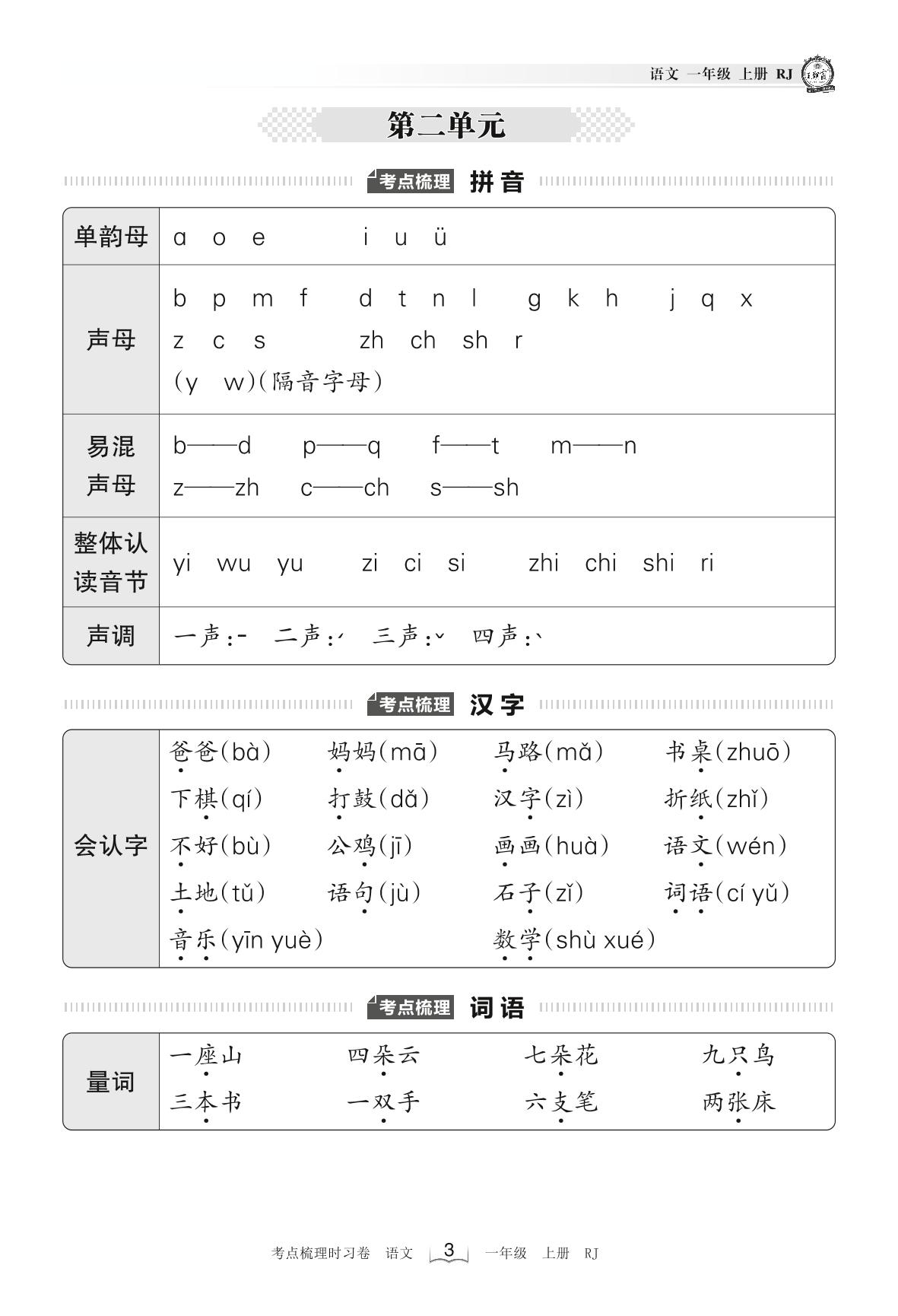 2022上册一年级语文人教版 考点梳理手册——第二单元