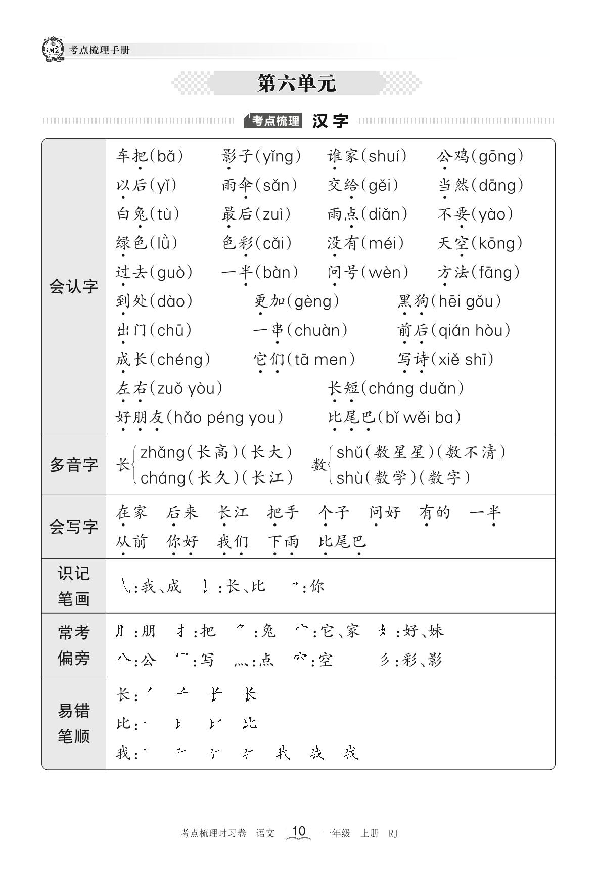 2022上册一年级语文人教版 考点梳理手册——第六单元