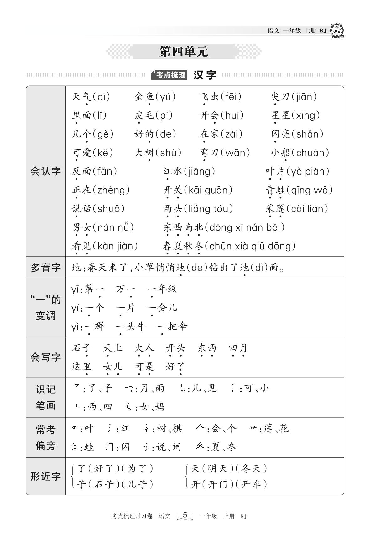 2022上册一年级语文人教版 考点梳理手册——第四单元