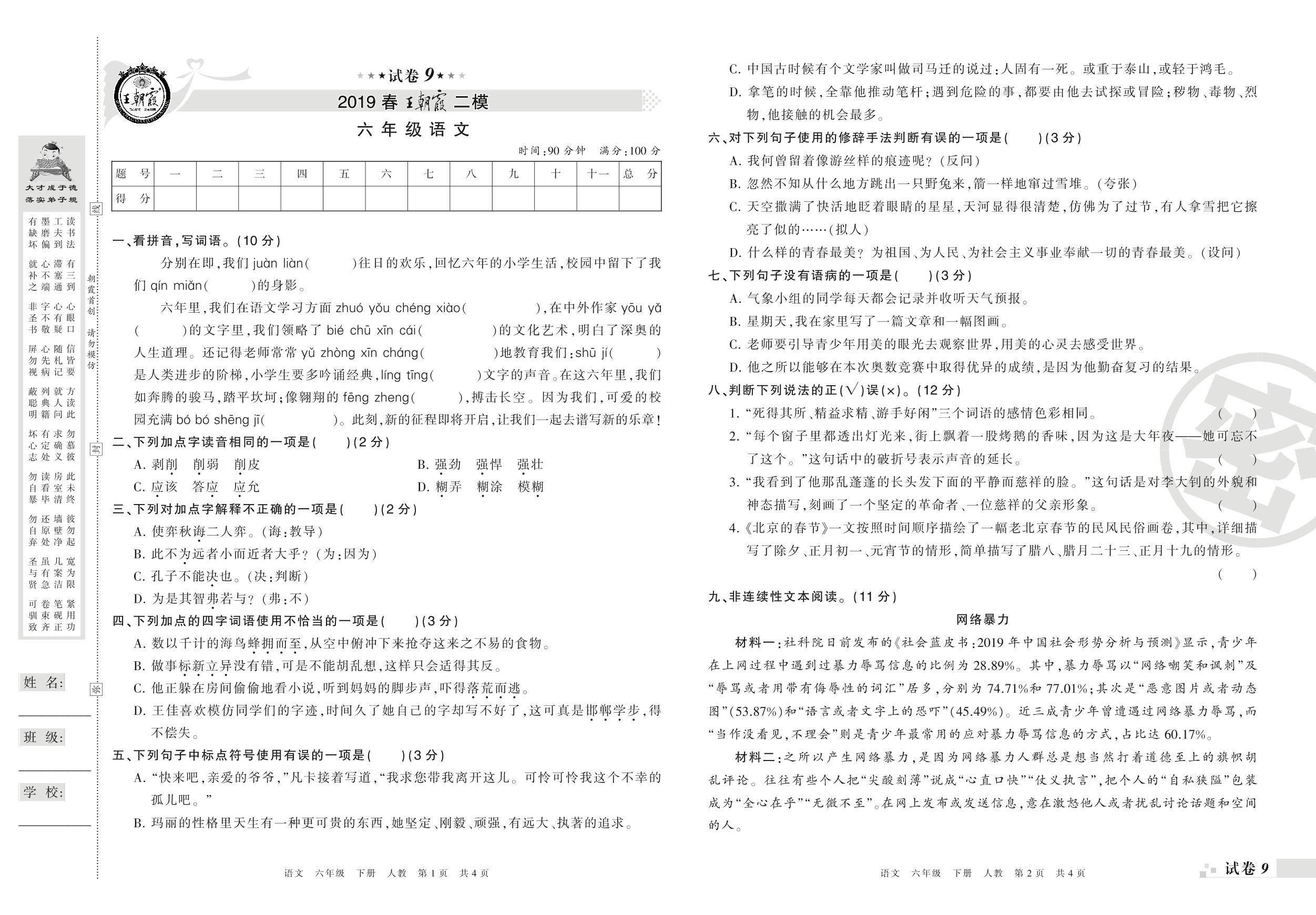 王朝霞期末模拟卷六年级下册语文(人教版)_R21080253608【9】