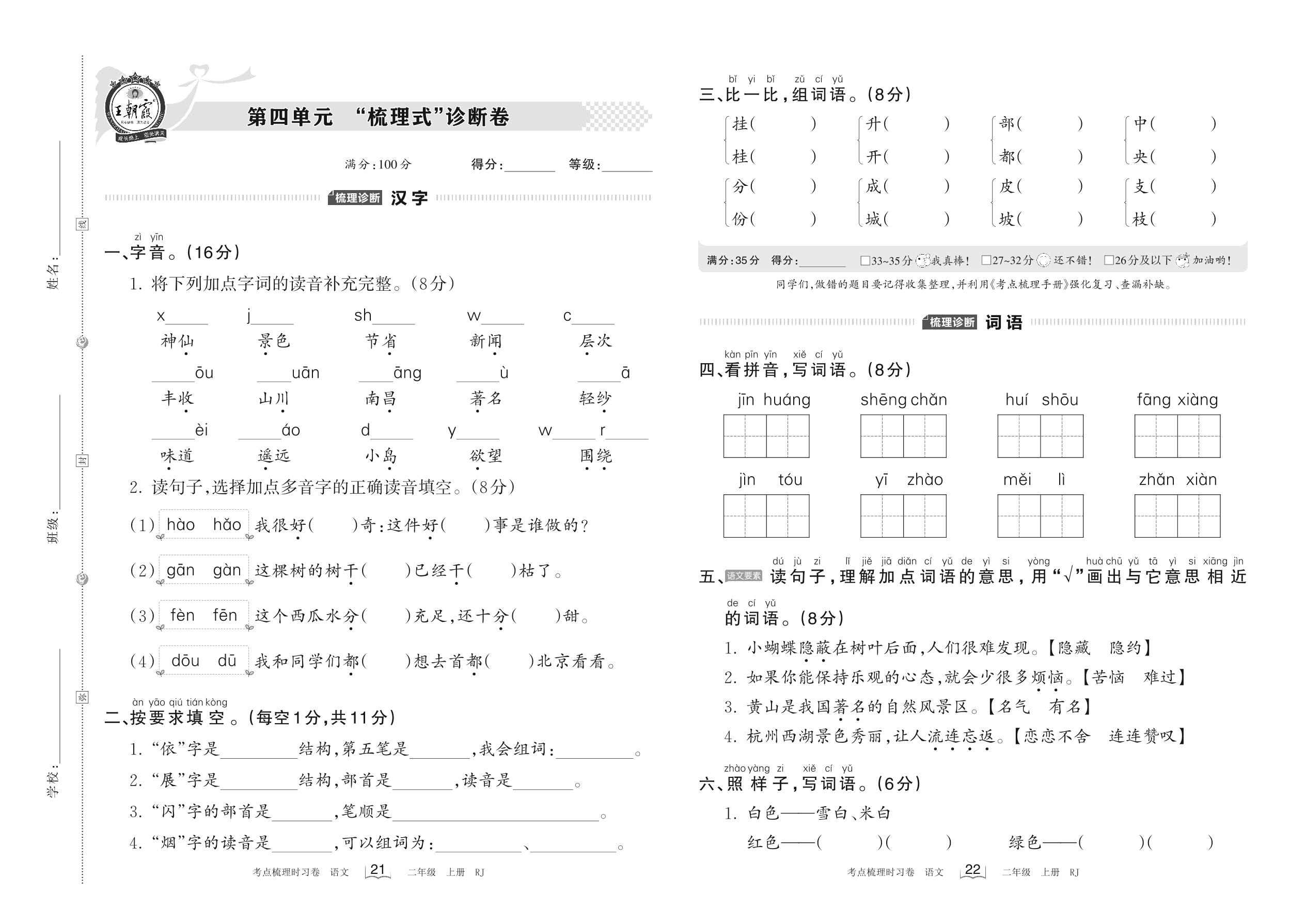 2022上册二年级语文人教版 第四单元 “梳理式”诊断卷