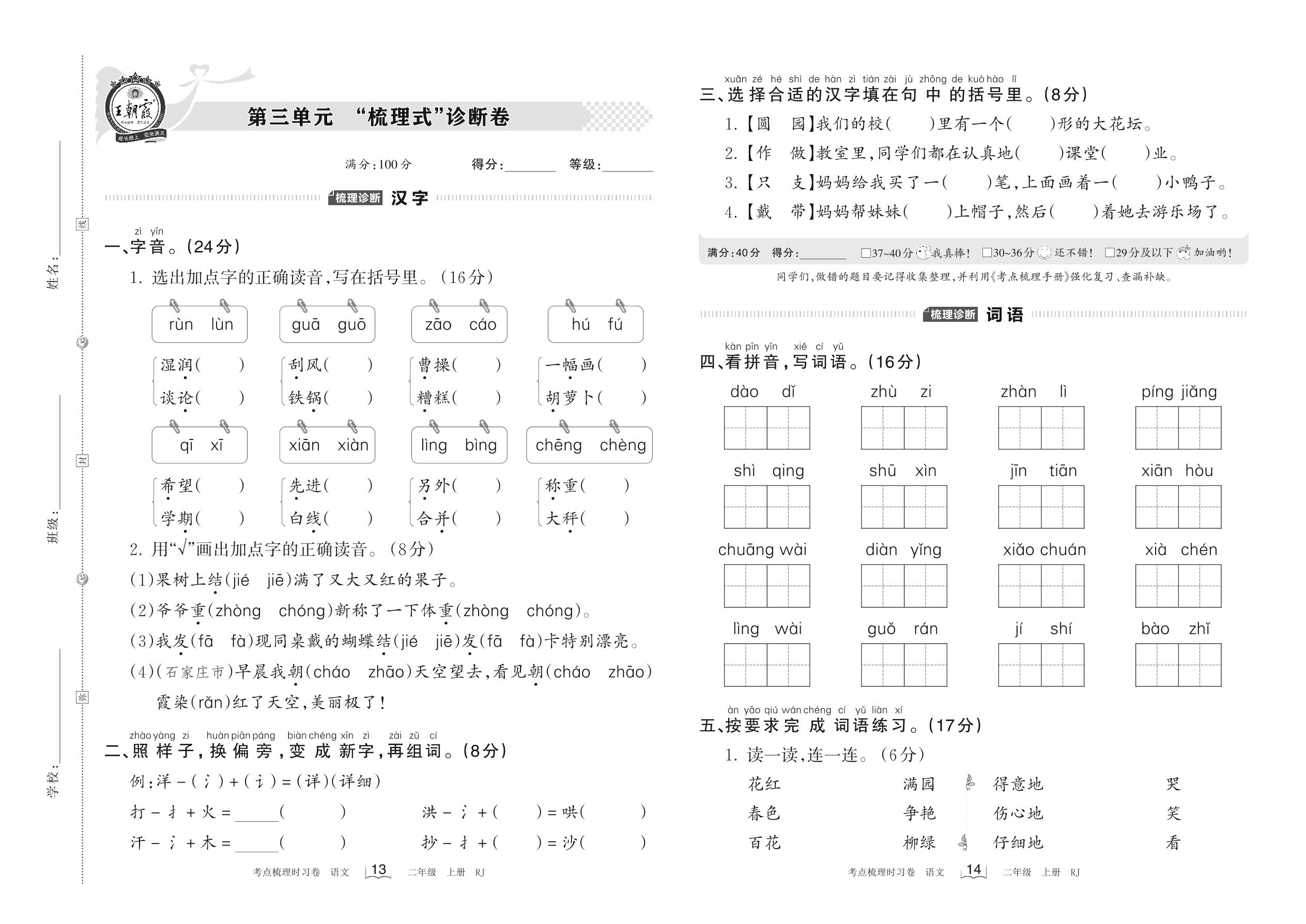 2022上册二年级语文人教版 第三单元 “梳理式”诊断卷