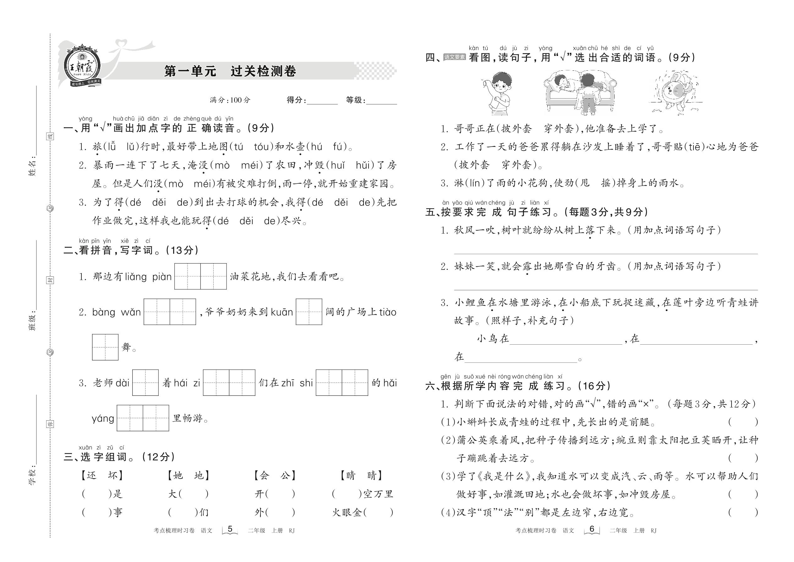 2022上册二年级语文人教版 第一单元 过关检测卷