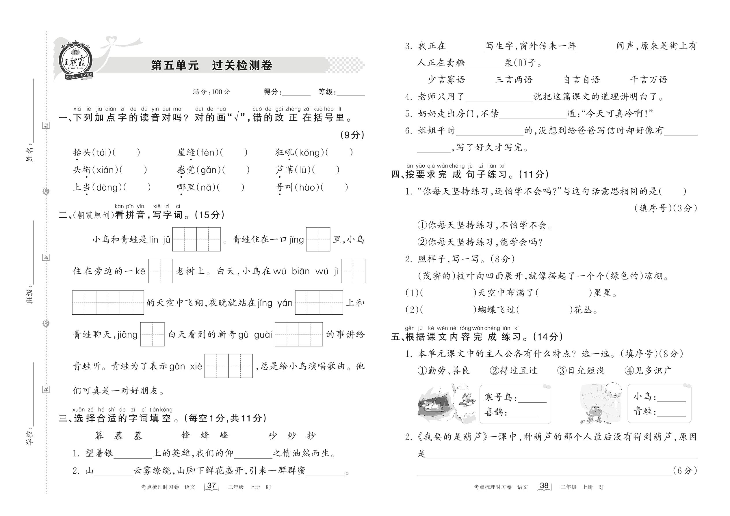 2022上册二年级语文人教版 第五单元 过关检测卷