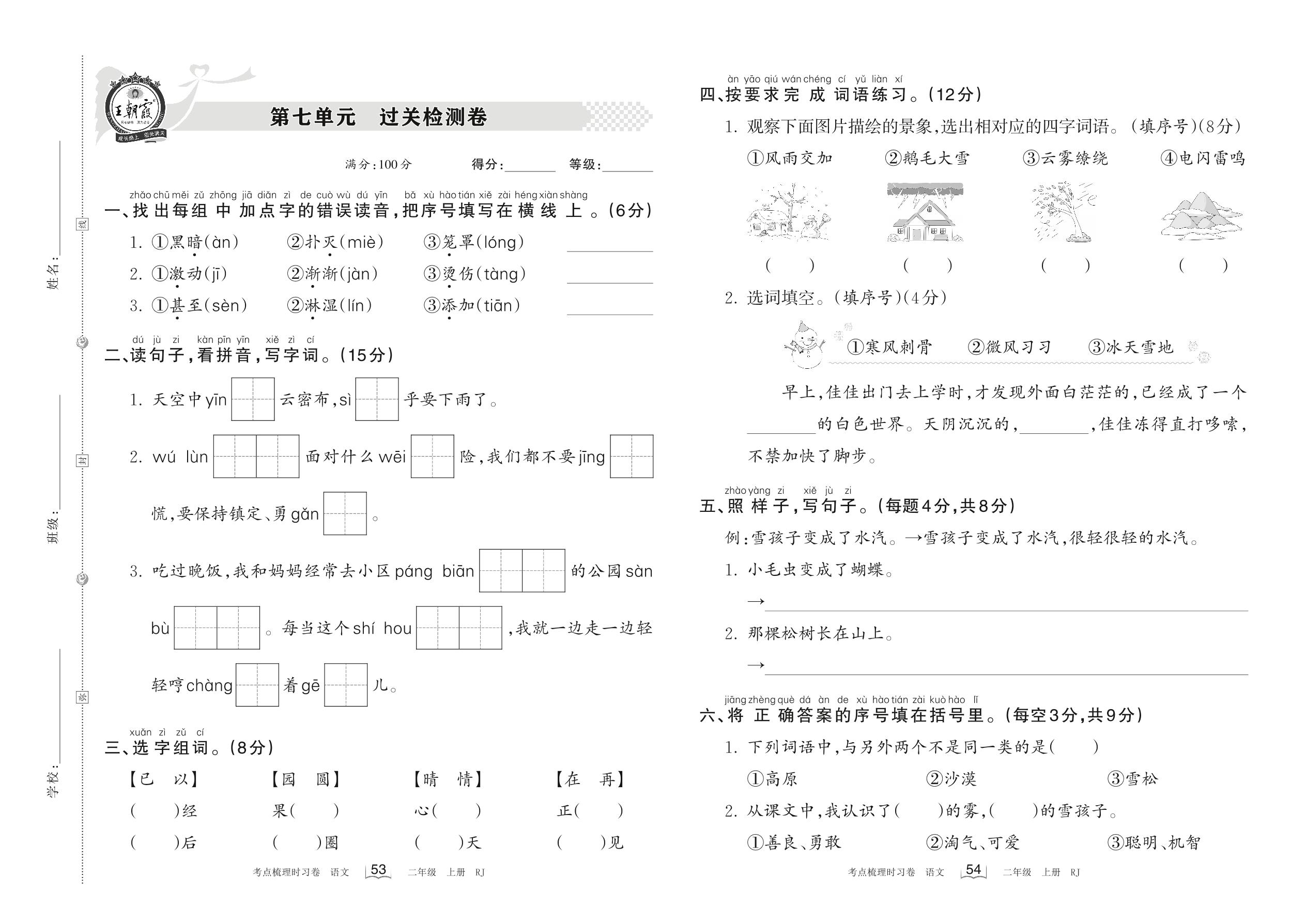 2022上册二年级语文人教版 第七单元 过关检测卷