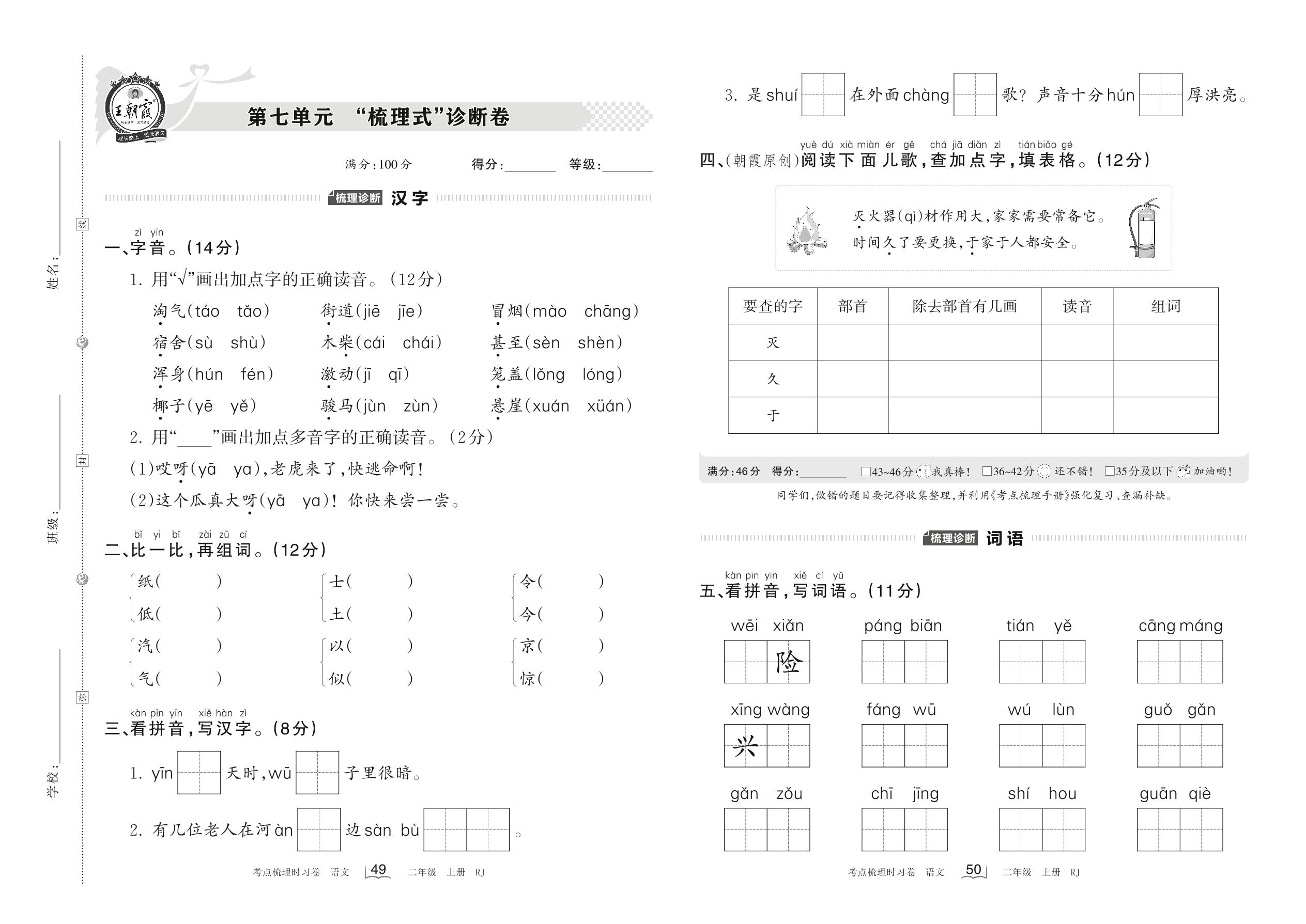 2022上册二年级语文人教版 第七单元 “梳理式”诊断卷