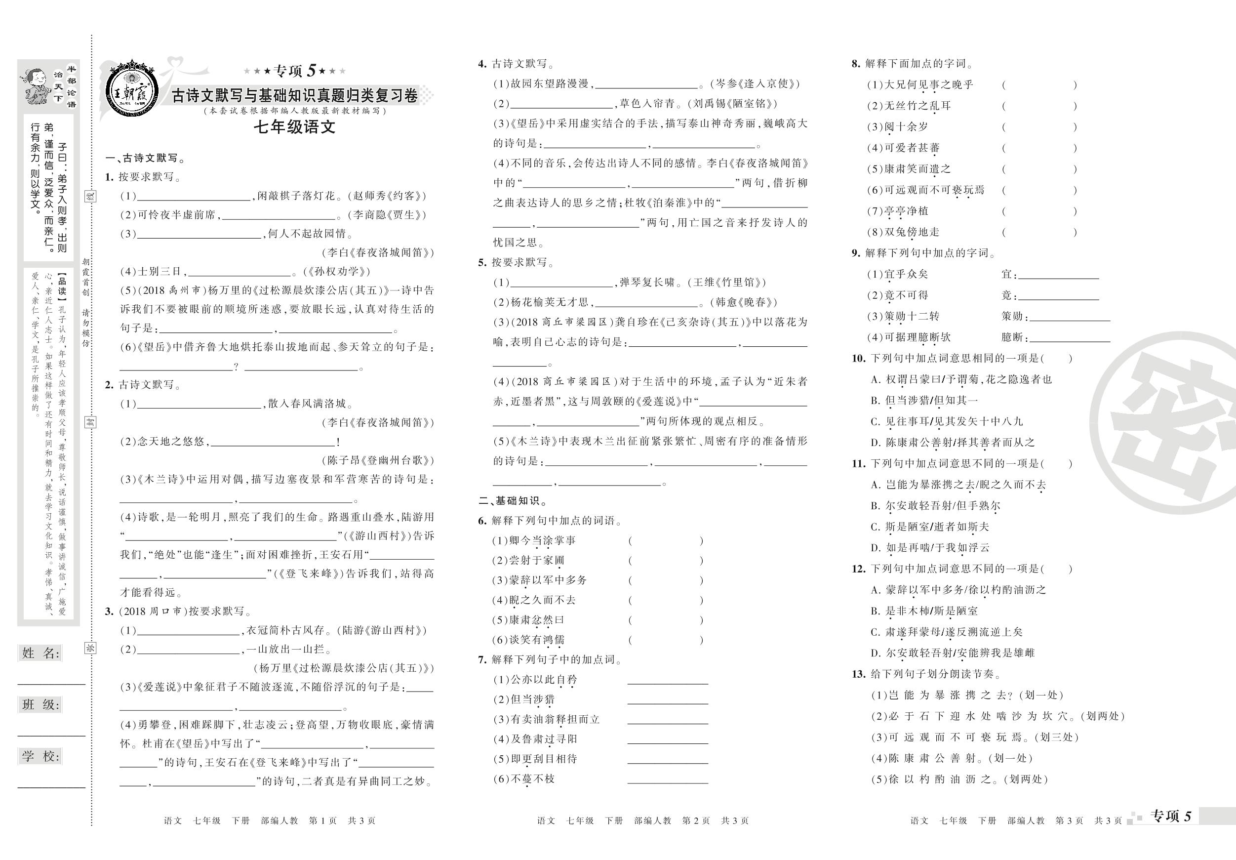 王朝霞期末专项卷——古诗文默写与基础知识、课内文言文阅读真题归类复习卷七年级下册语文(人教版)_R21080253629【0】