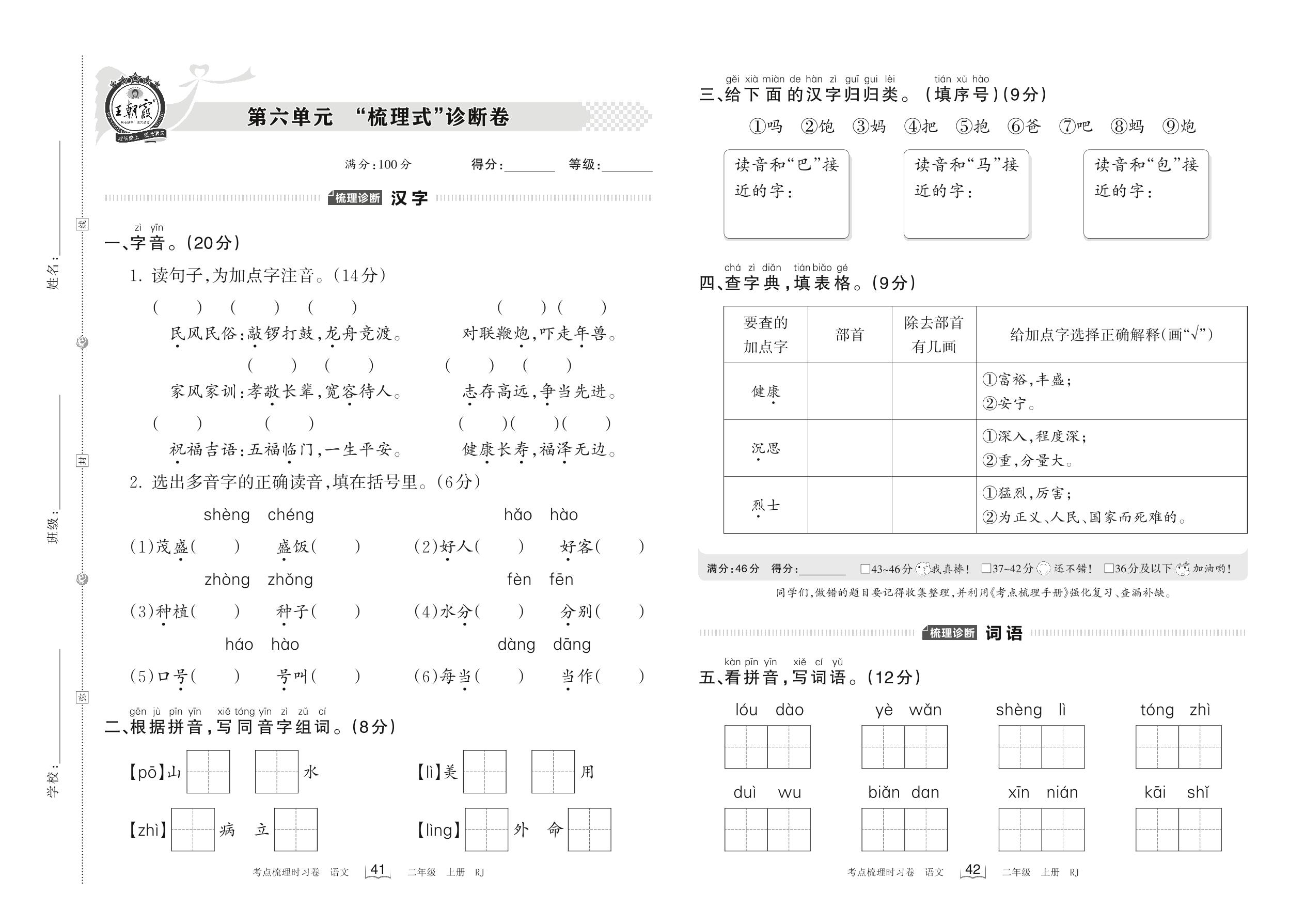 2022上册二年级语文人教版 第六单元 “梳理式”诊断卷