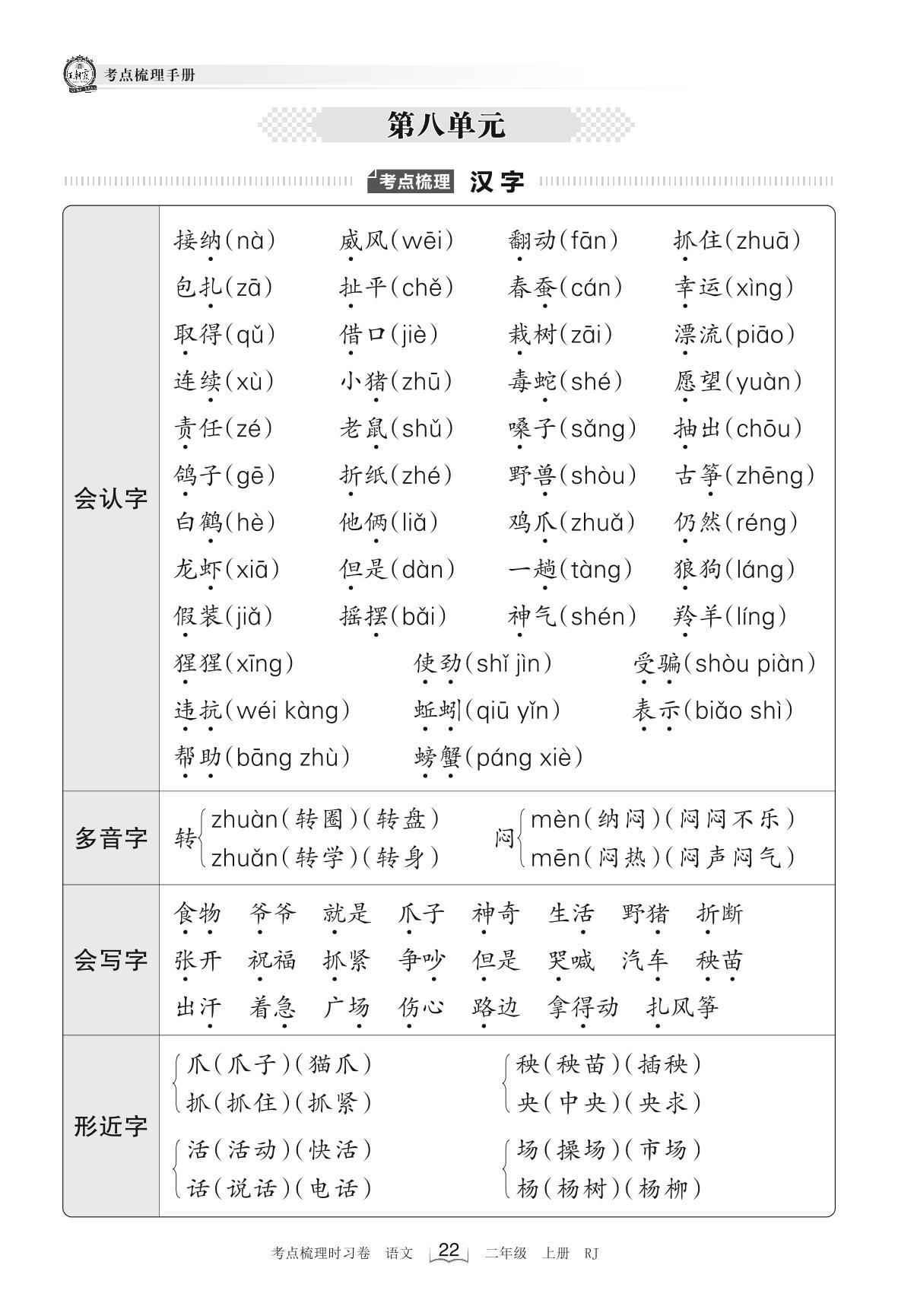 2022上册二年级语文人教版 考点梳理手册——第八单元