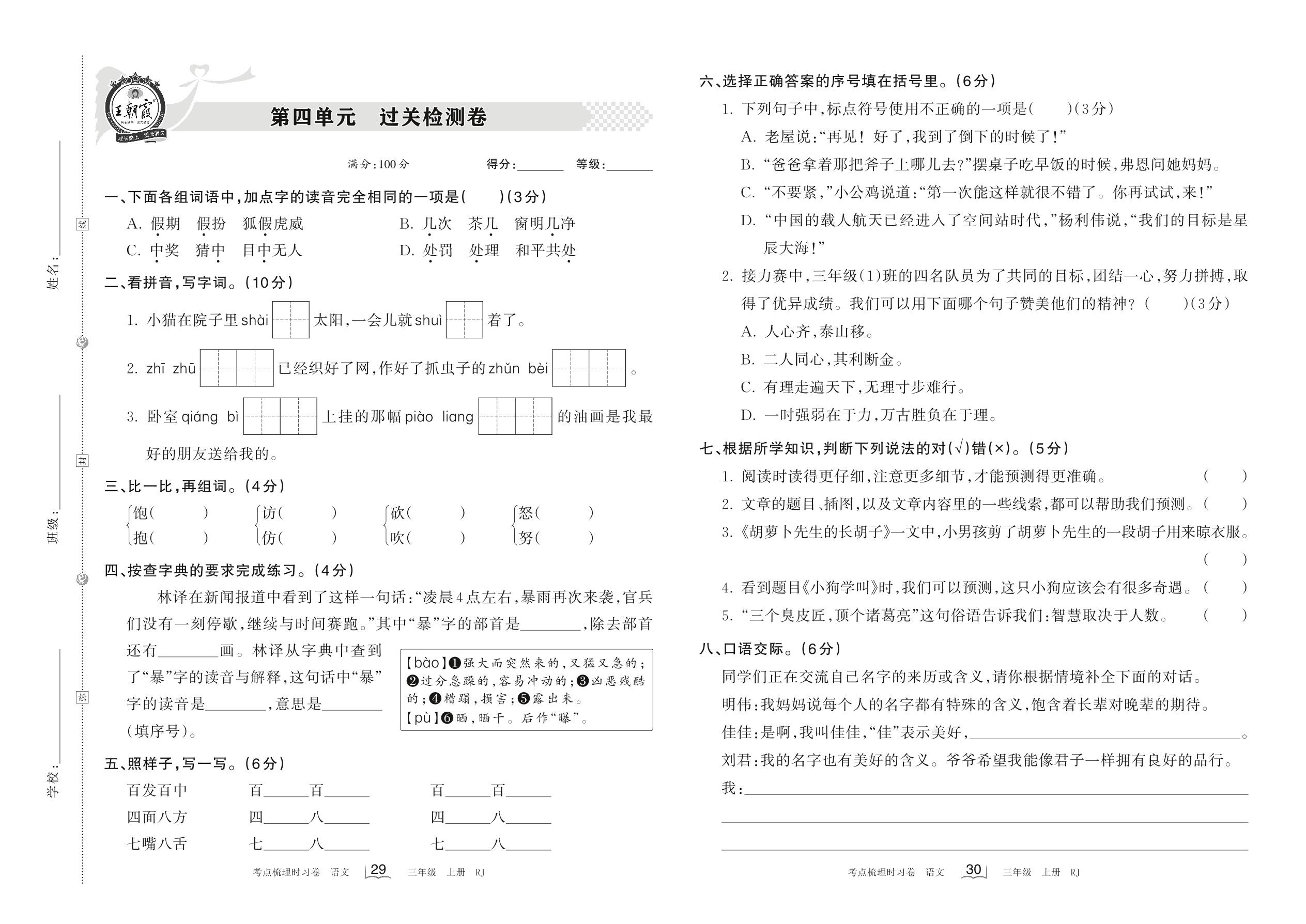 2022上册三年级语文人教版 第四单元 过关检测卷