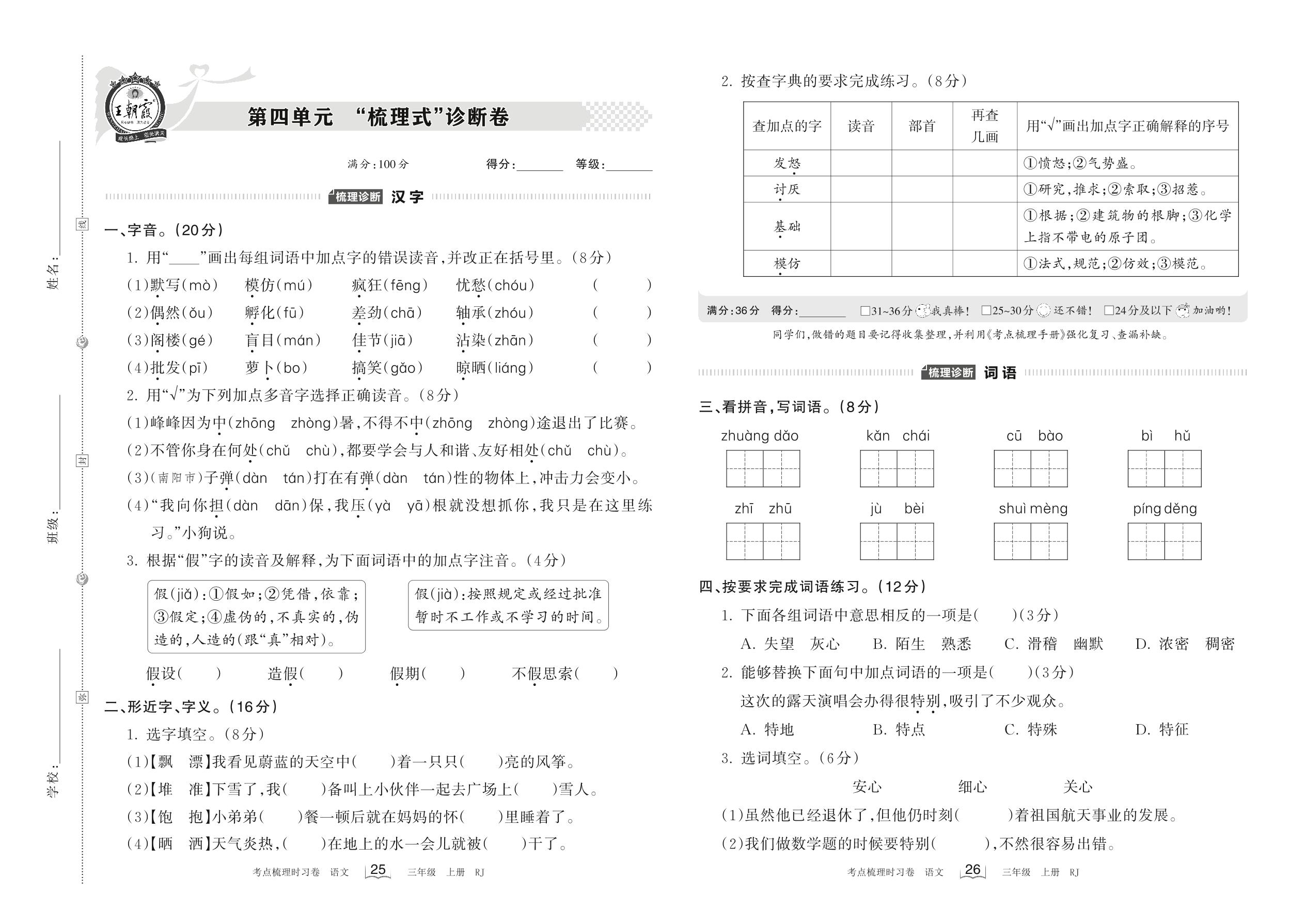 2022上册三年级语文人教版 第四单元 “梳理式”诊断卷