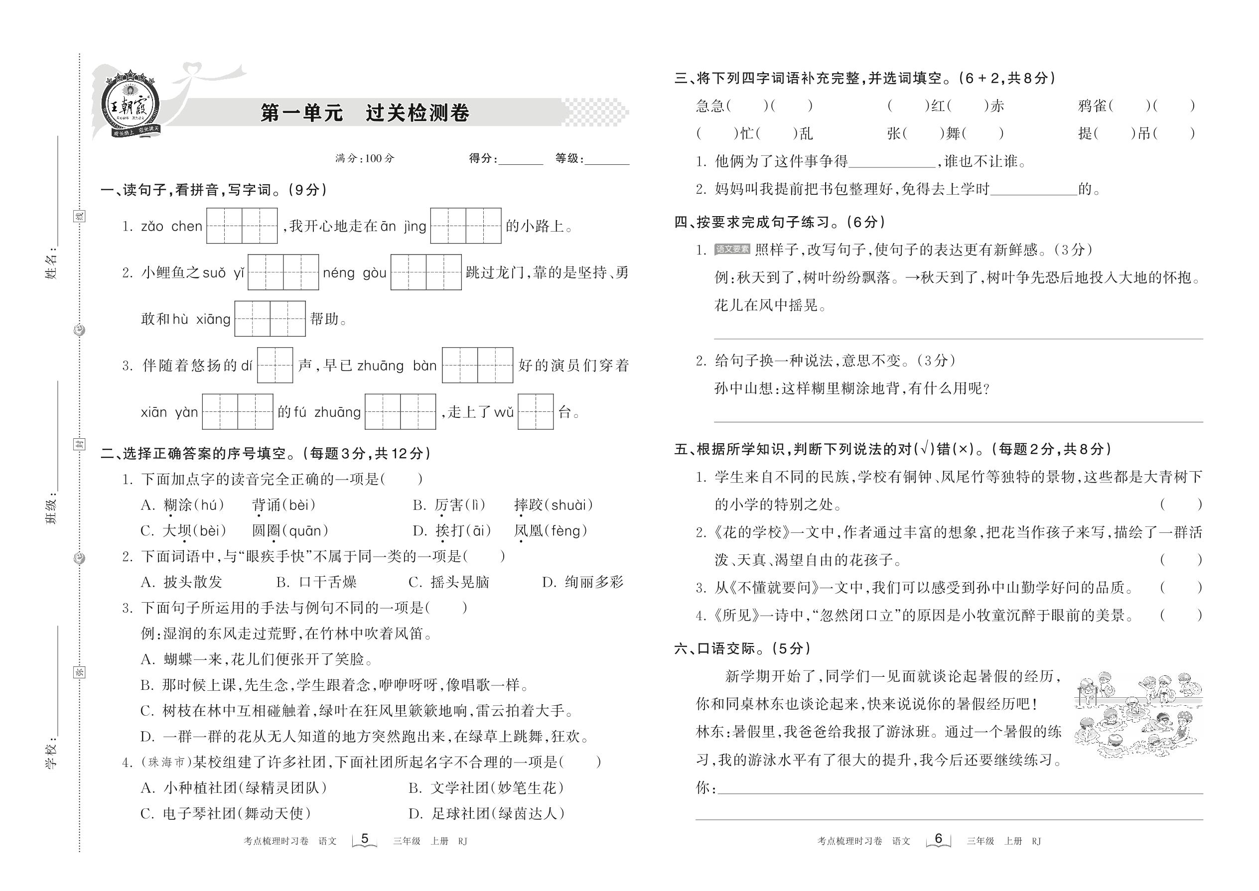 2022上册三年级语文人教版 第一单元 过关检测卷