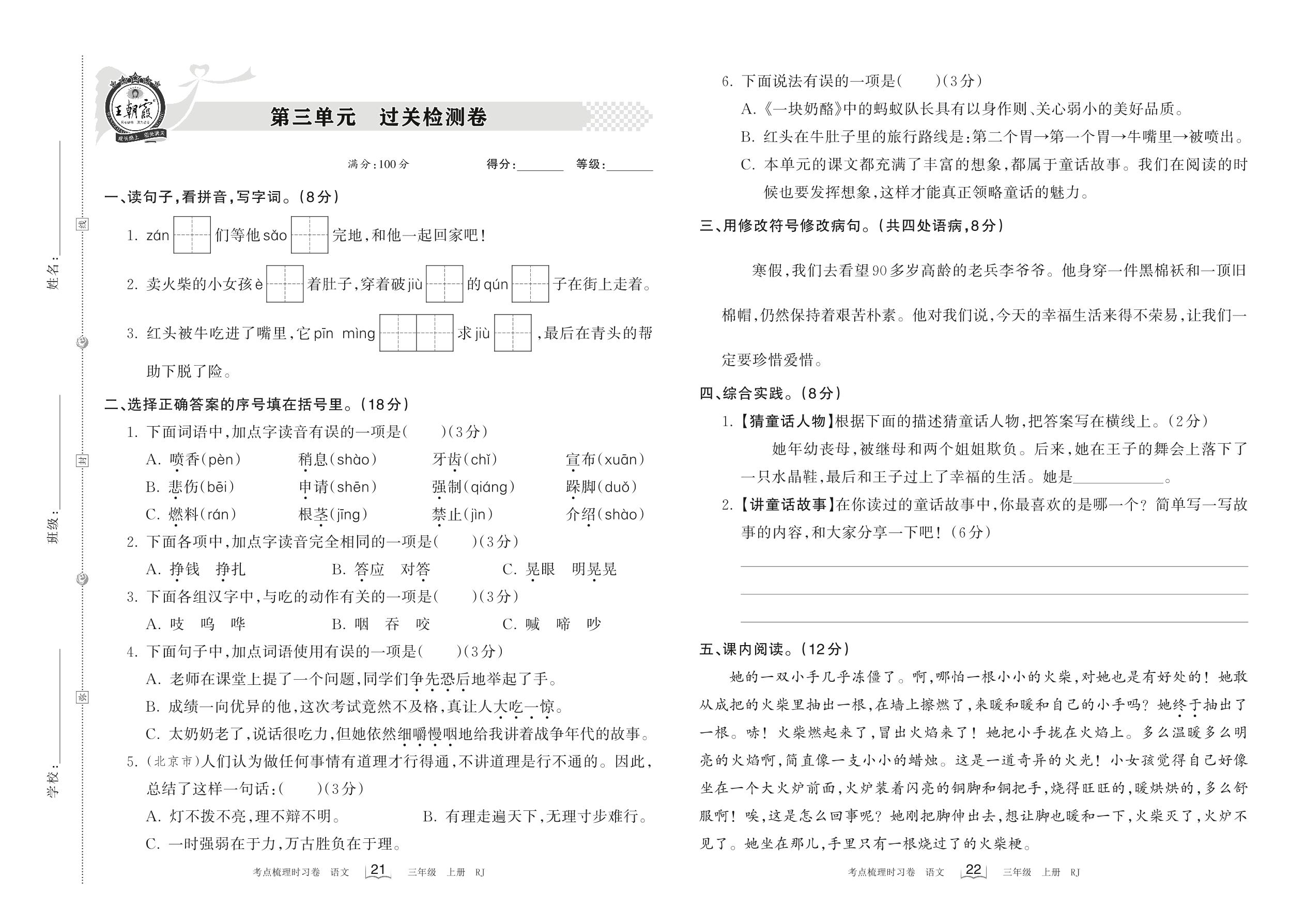 2022上册三年级语文人教版 第三单元 过关检测卷