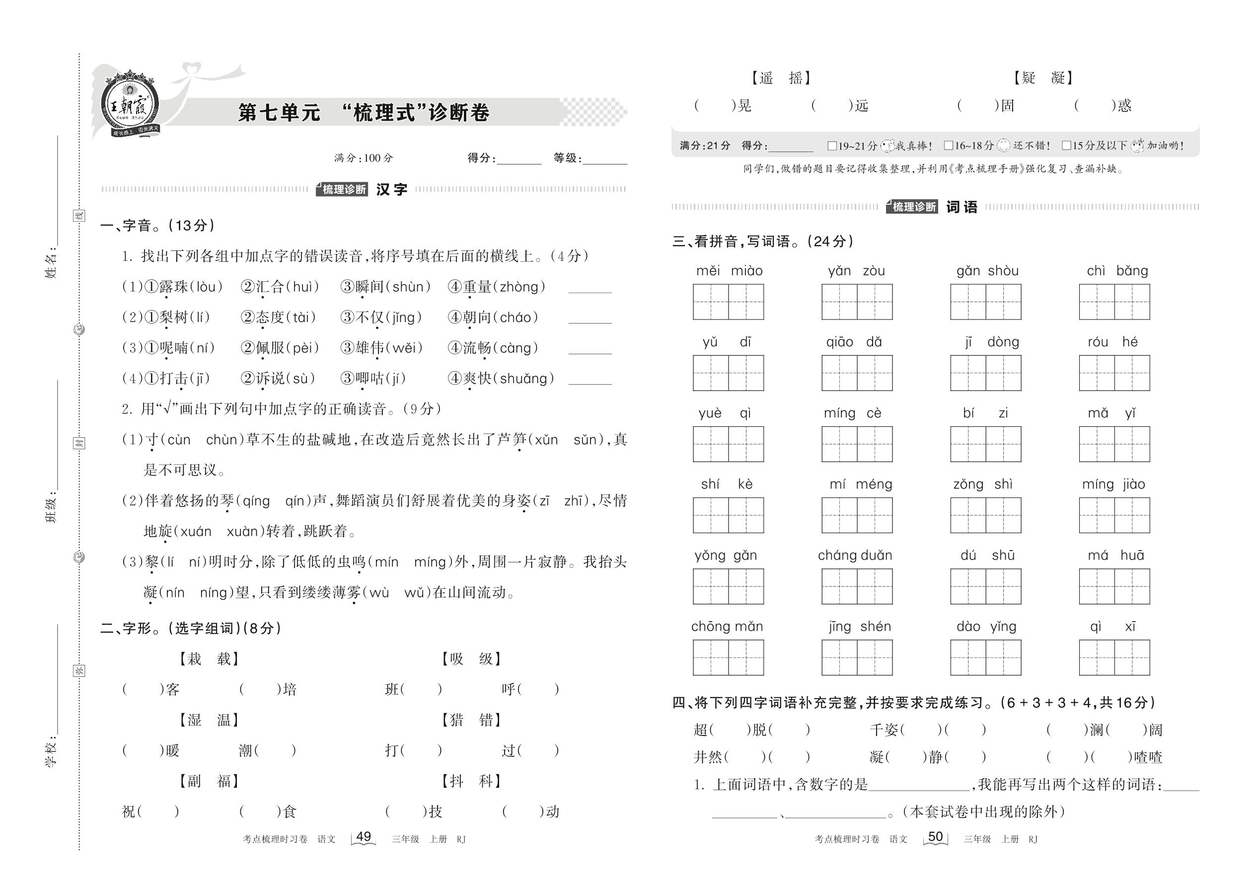 2022上册三年级语文人教版 第七单元 “梳理式”诊断卷