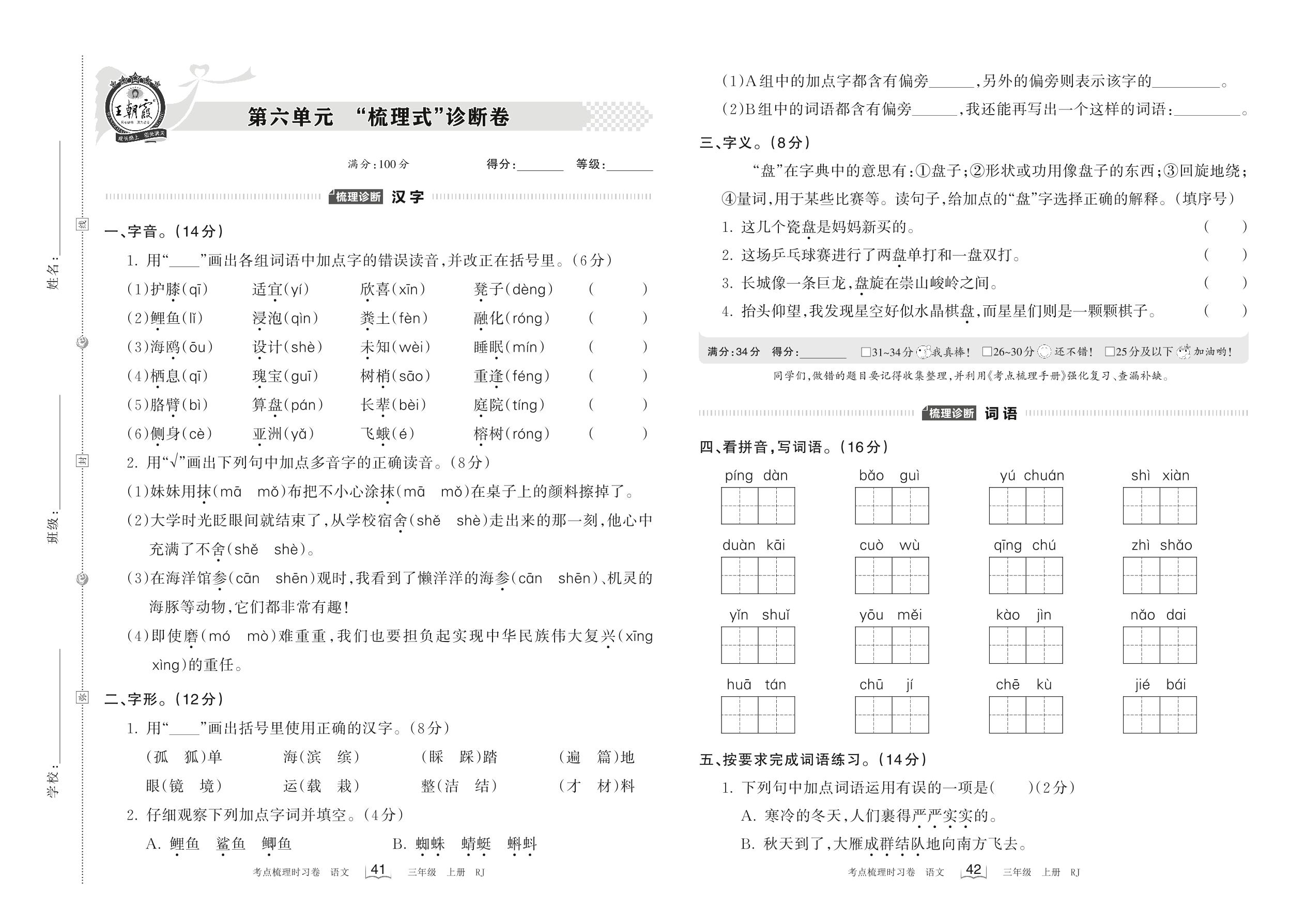 2022上册三年级语文人教版 第六单元 “梳理式”诊断卷