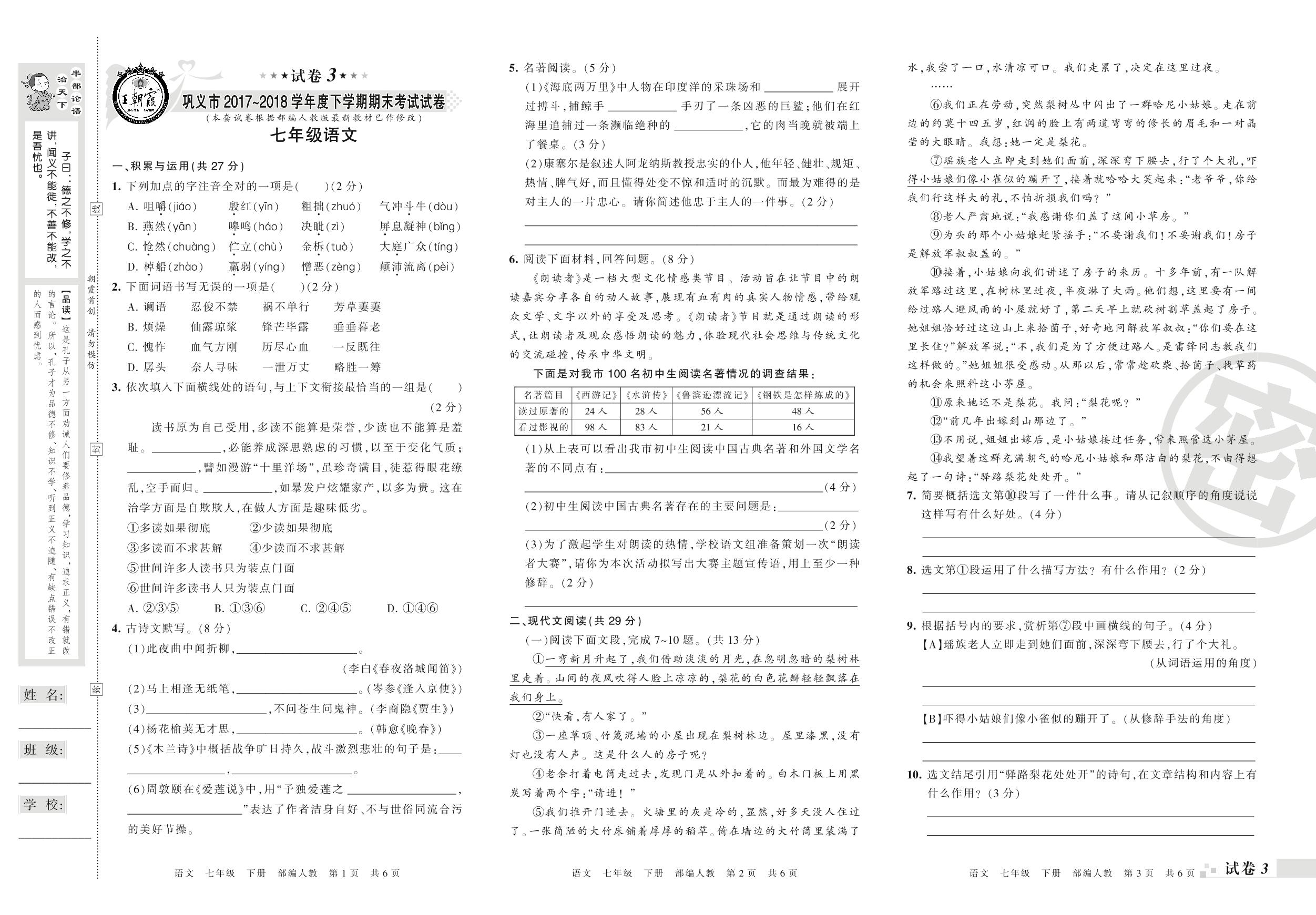 2017-2018学年第二学期巩义市七年级语文试卷(人教版)【3】