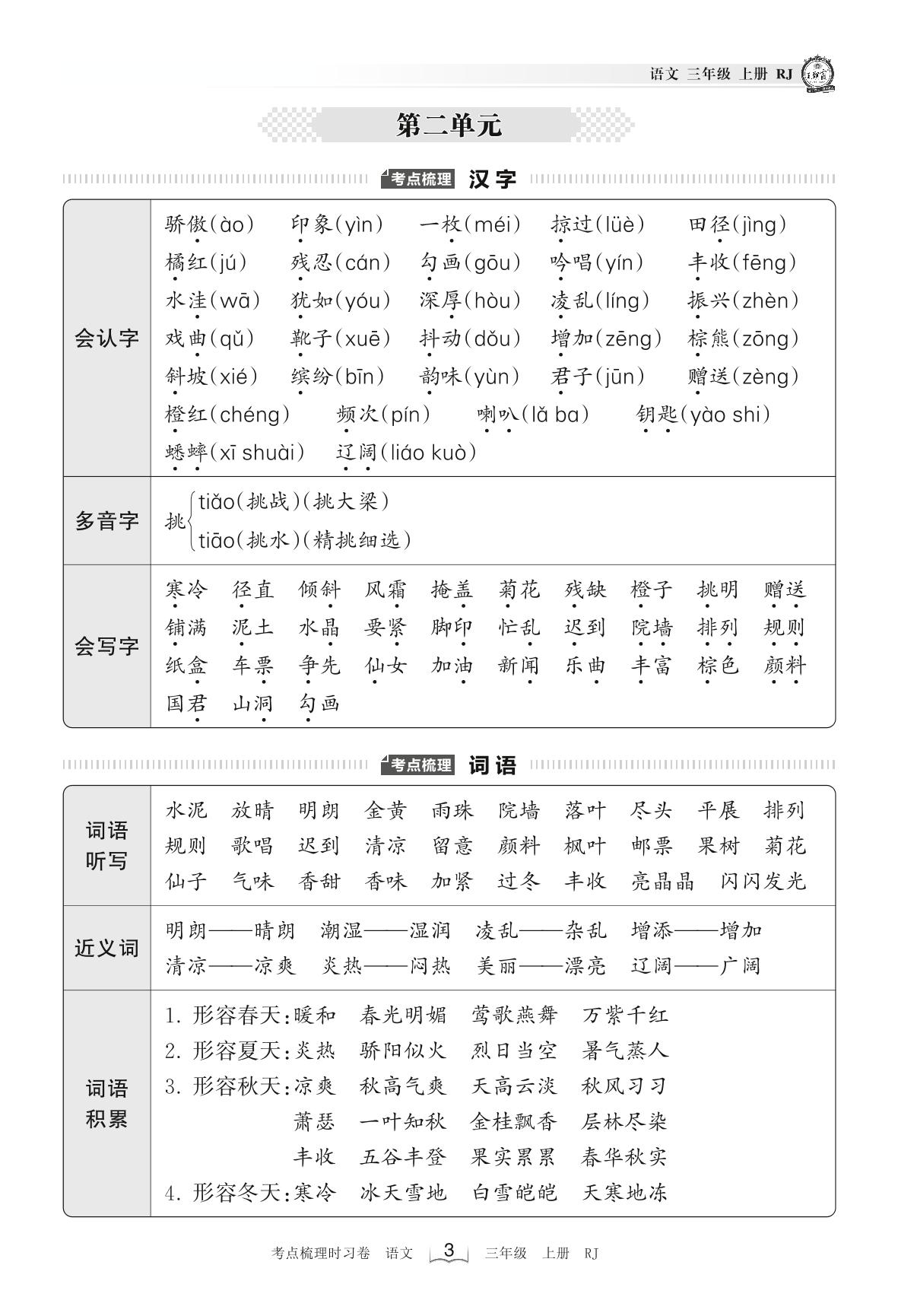2022上册三年级语文人教版 考点梳理手册——第二单元