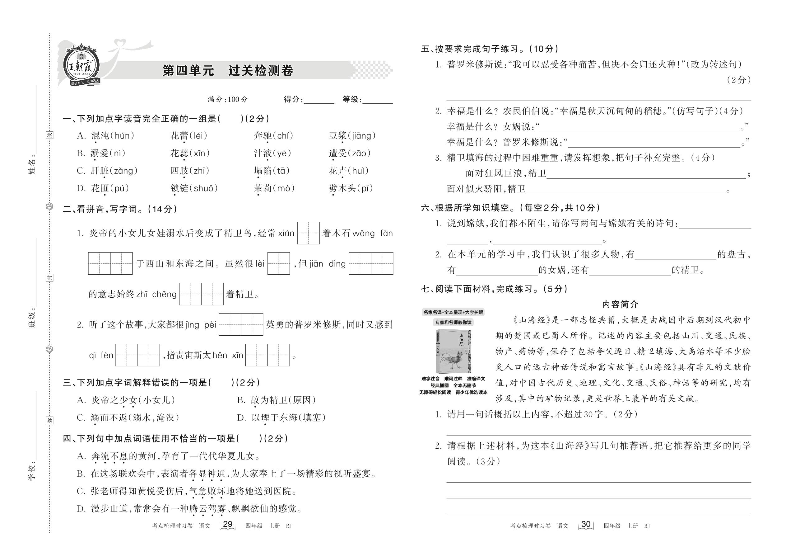2022上册四年级语文人教版 第四单元 过关检测卷