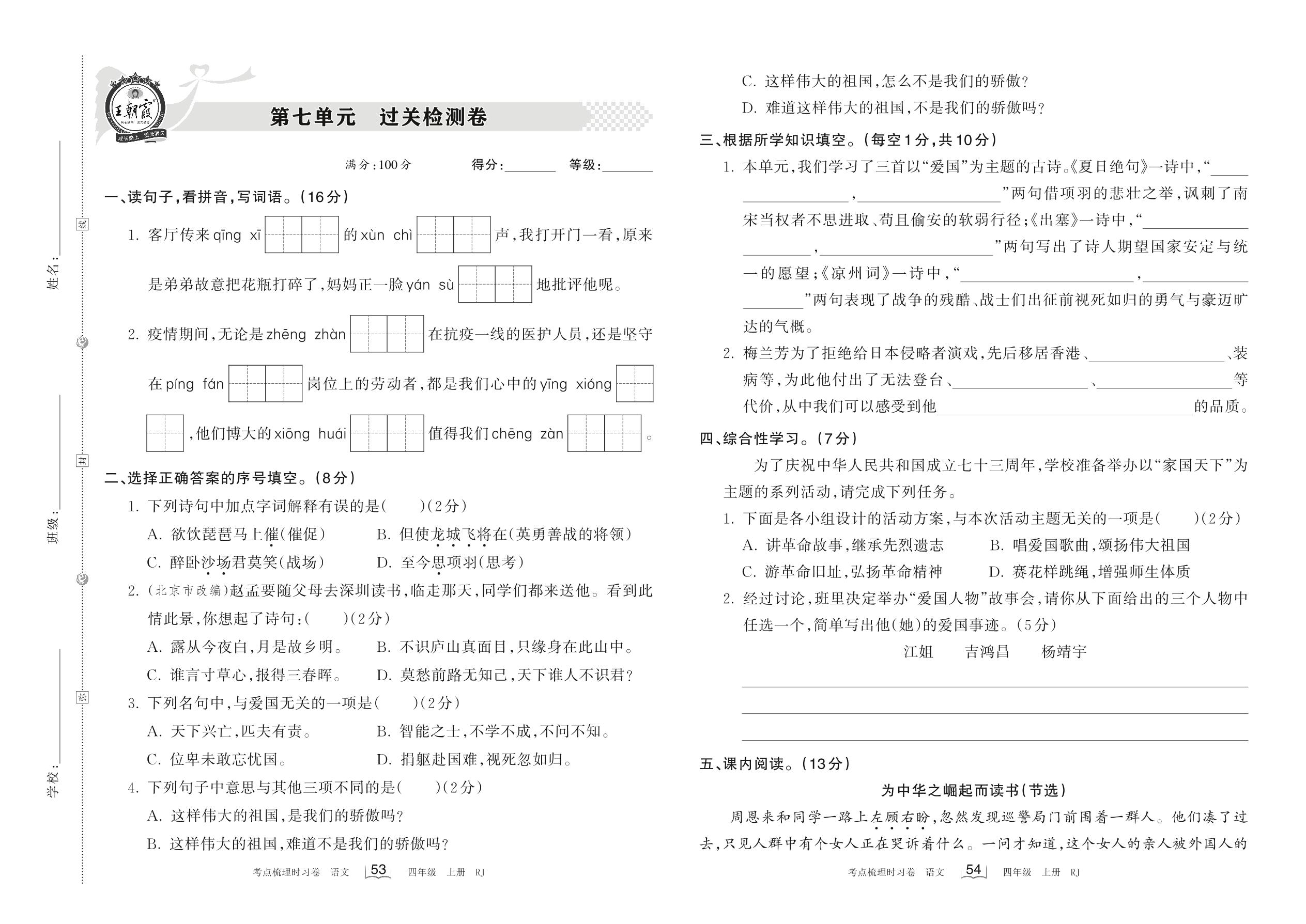 2022上册四年级语文人教版 第七单元 过关检测卷