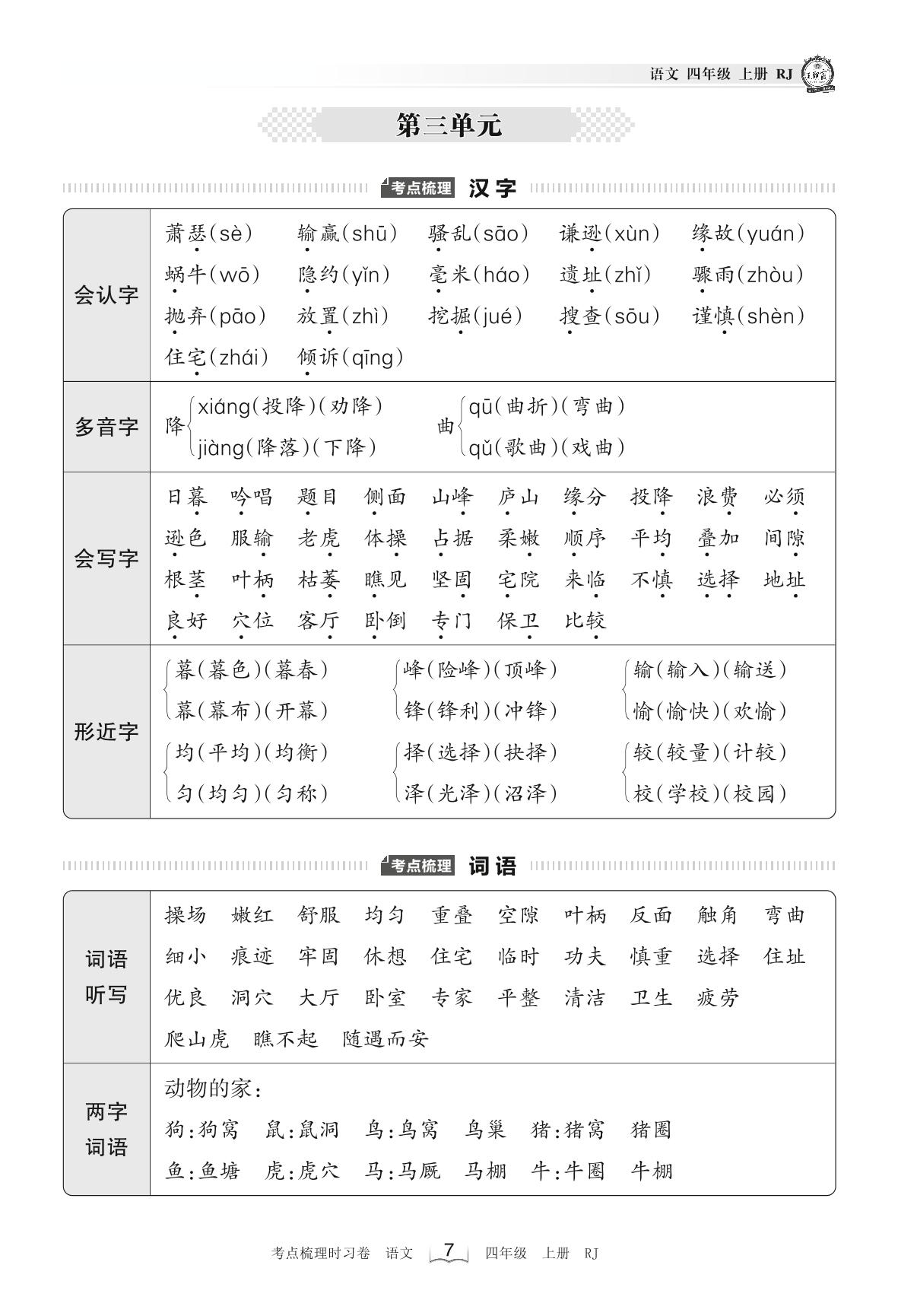 2022上册四年级语文人教版 考点梳理手册——第三单元