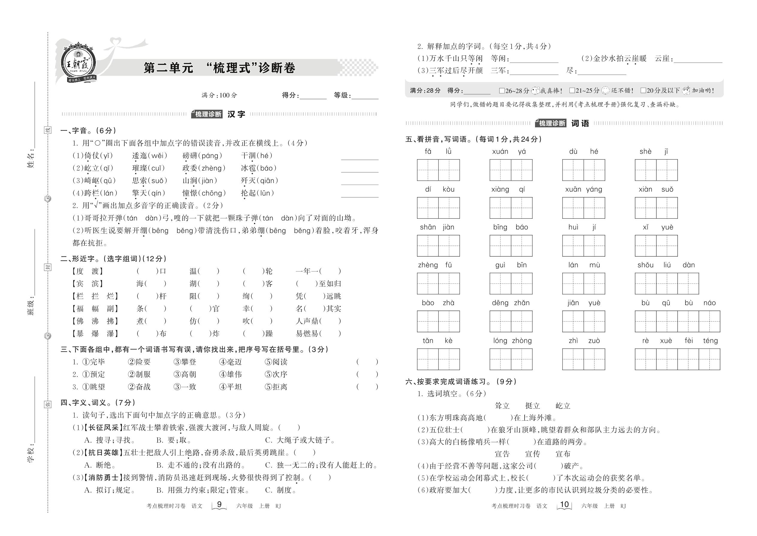 2022上册六年级语文人教版 第二单元 “梳理式”诊断卷