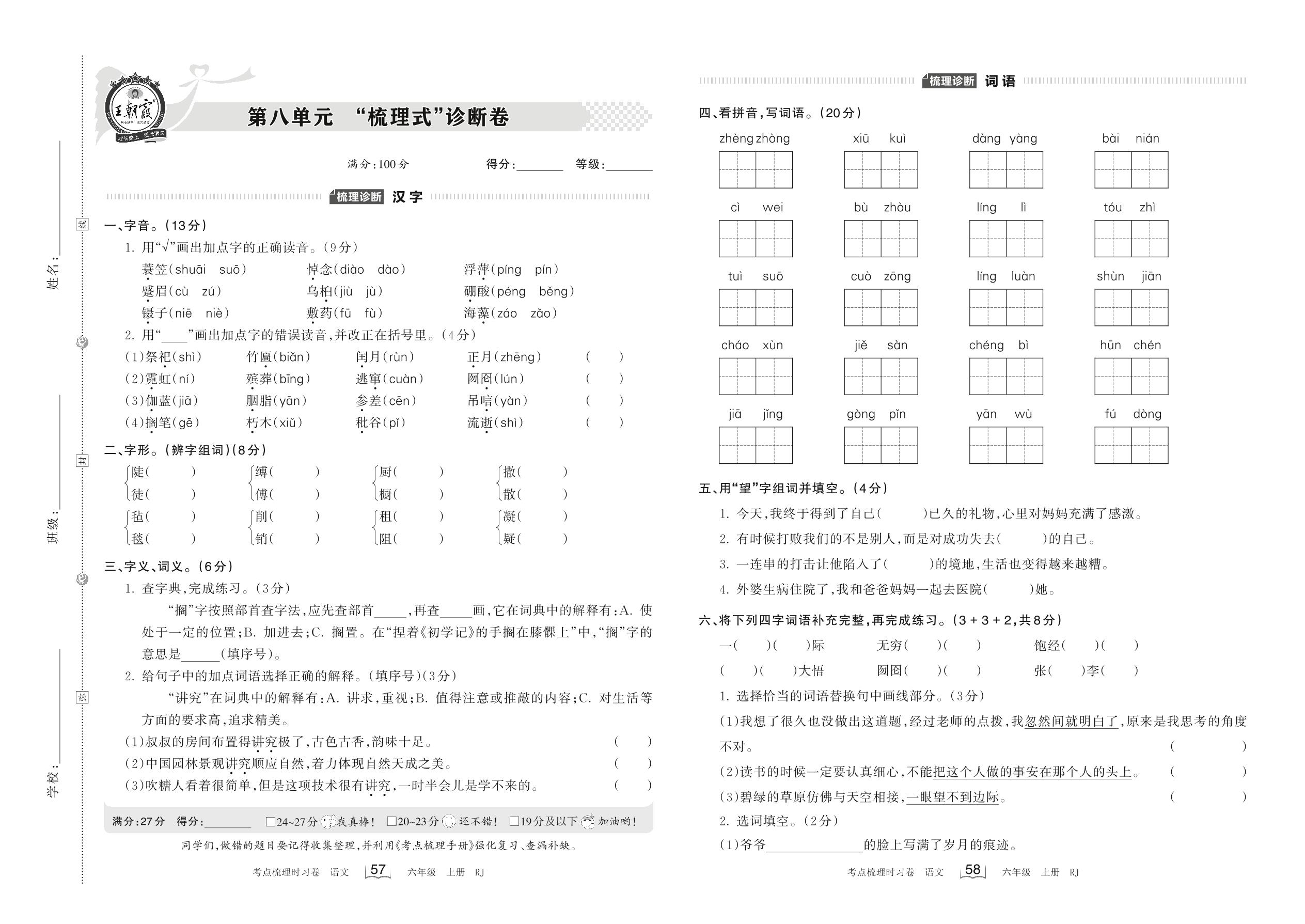 2022上册六年级语文人教版 第八单元 “梳理式”诊断卷