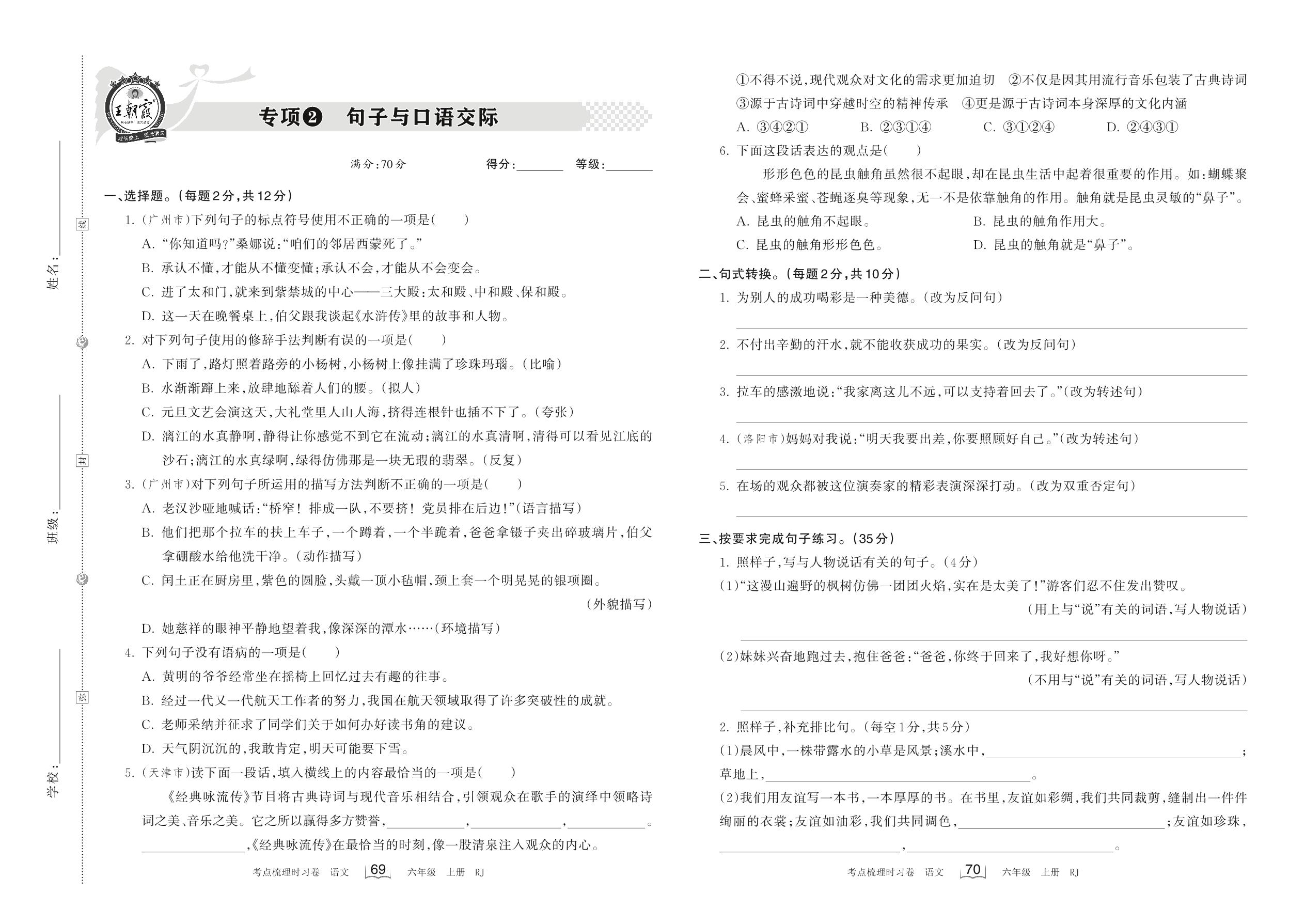2022上册六年级语文人教版 专项2 句子与口语交际