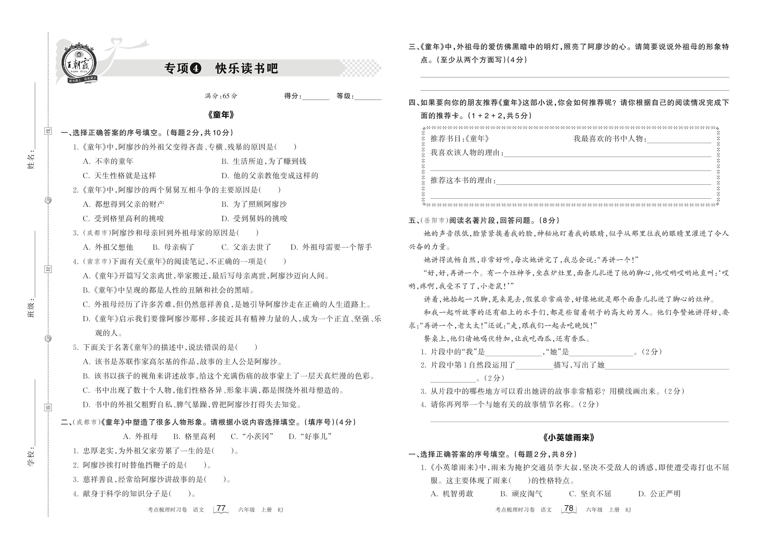 2022上册六年级语文人教版 专项4 快乐读书吧