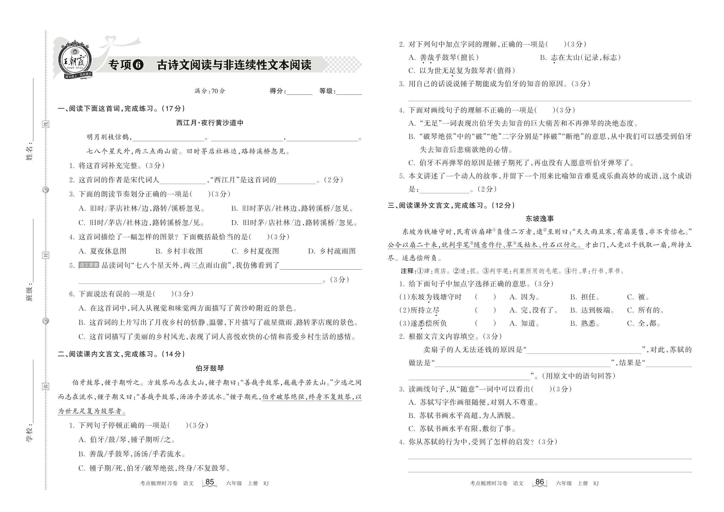 2022上册六年级语文人教版 专项6 古诗文阅读与非连续性文本阅读