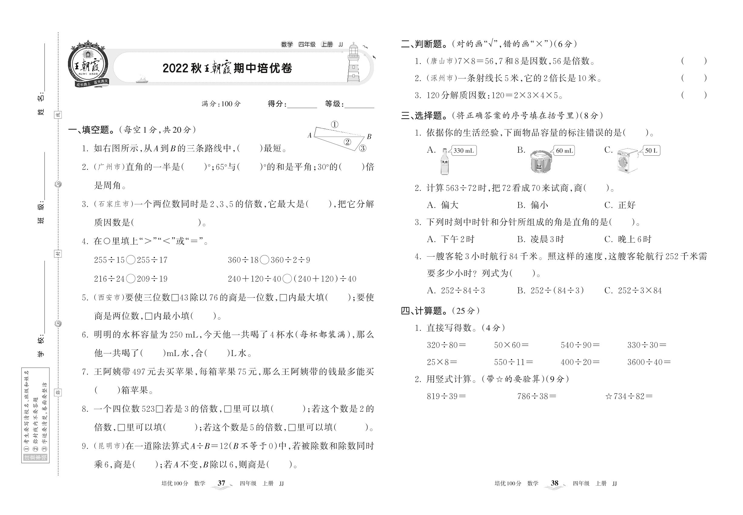 2022上册四年级数学冀教版 2022秋王朝霞期中培优卷