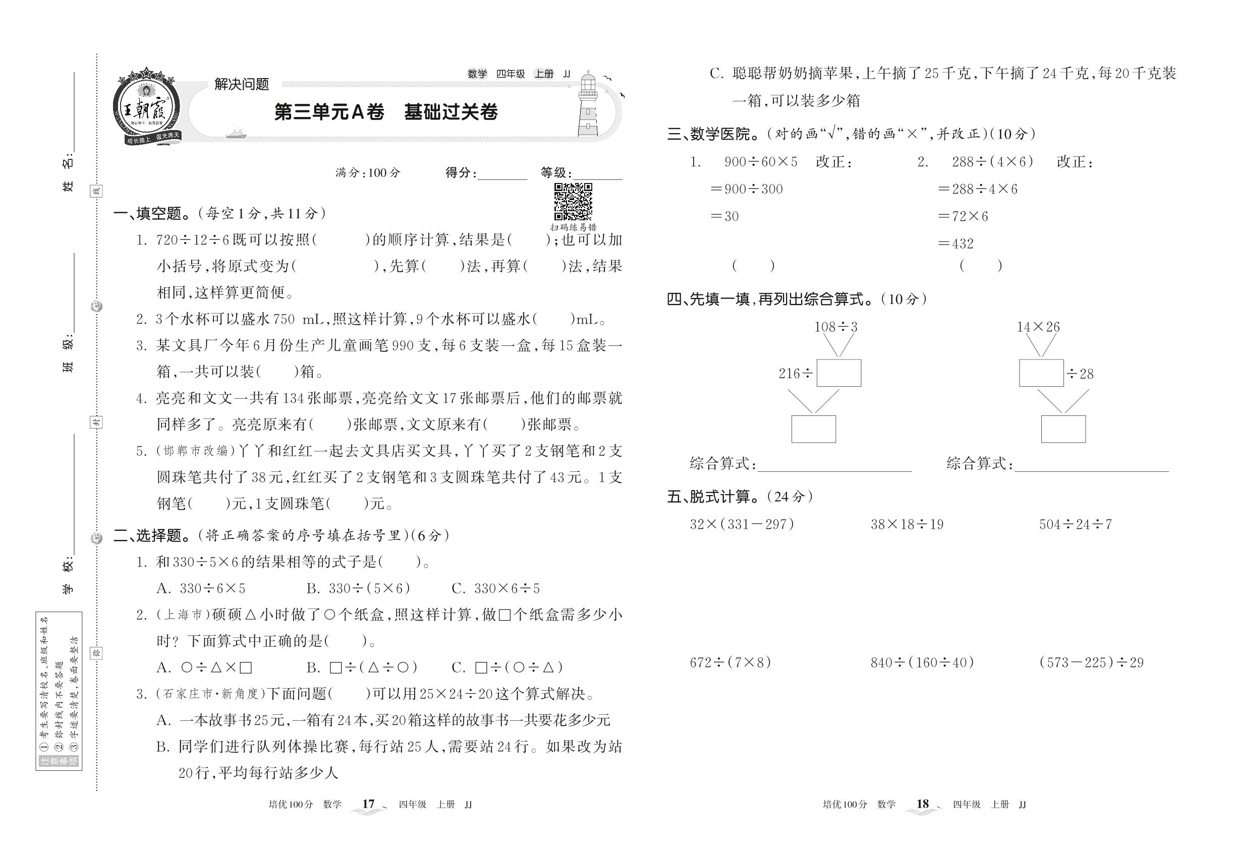 2022上册四年级数学冀教版 第三单元A卷 基础过关卷