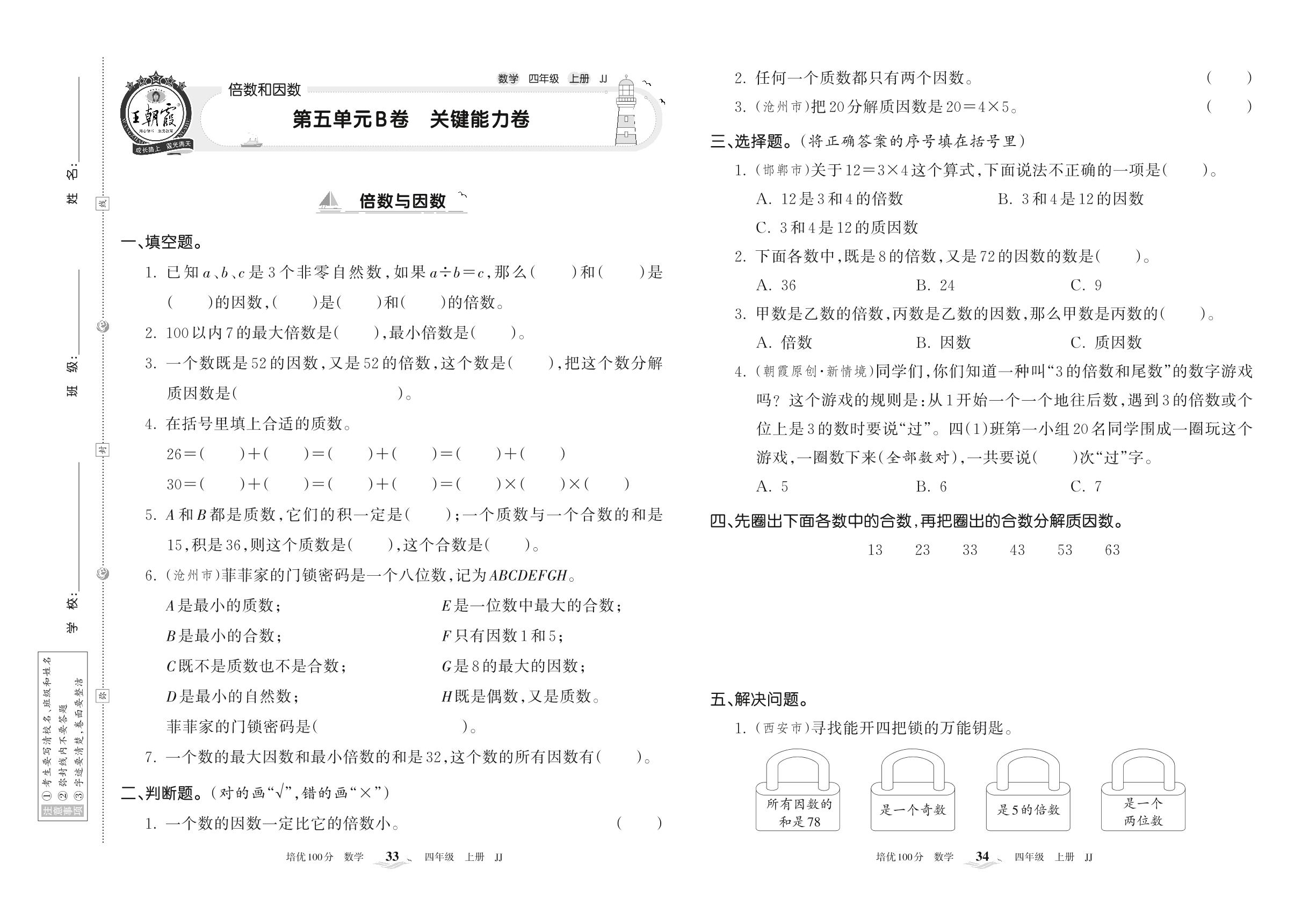 2022上册四年级数学冀教版 第五单元B卷 关键能力卷