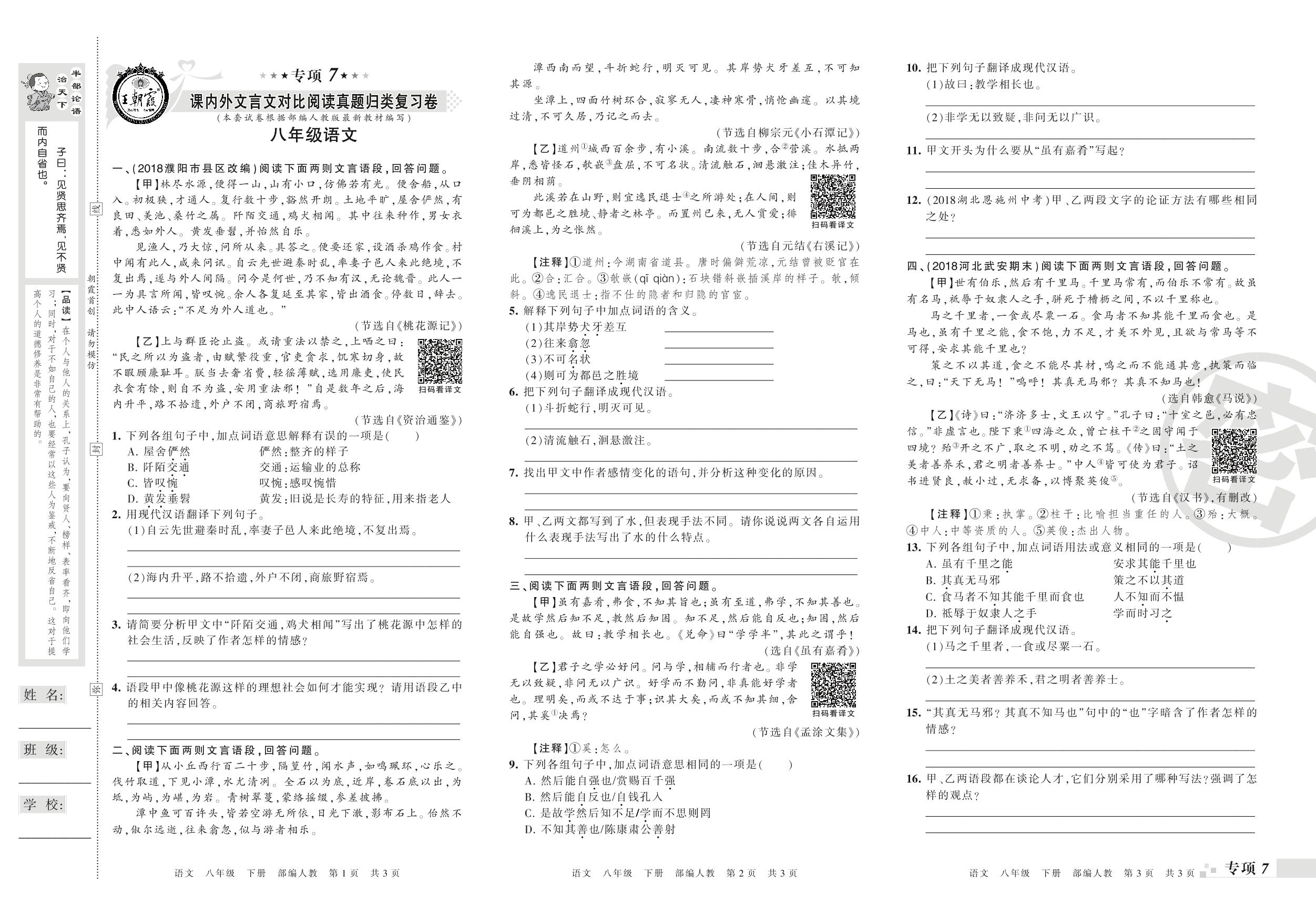 王朝霞期末专项卷——课内外文言文对比阅读、古诗词阅读真题归类复习卷八年级下册语文(人教版)_R21080253835【0】