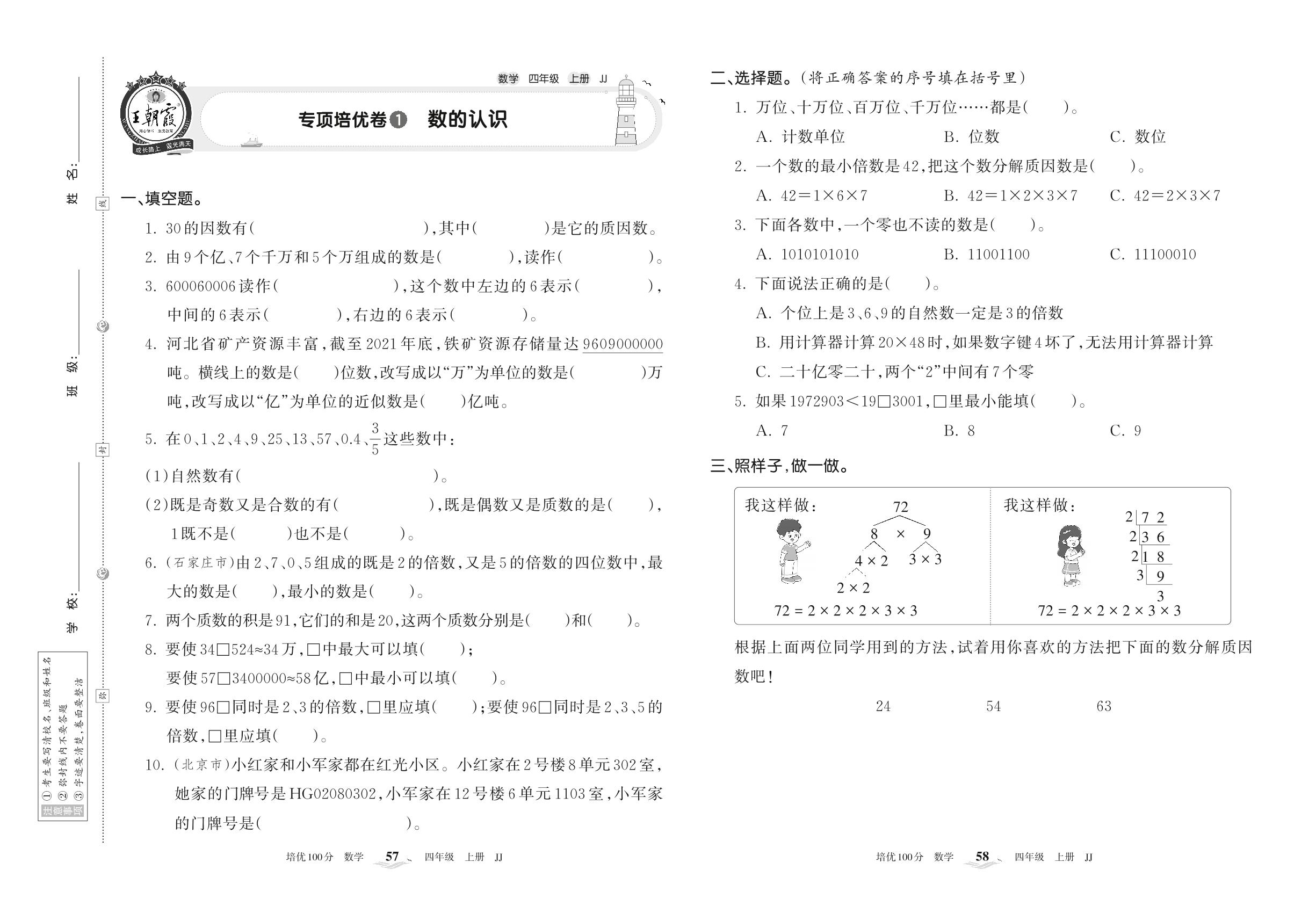 2022上册四年级数学冀教版 专项培优卷1 数的认识