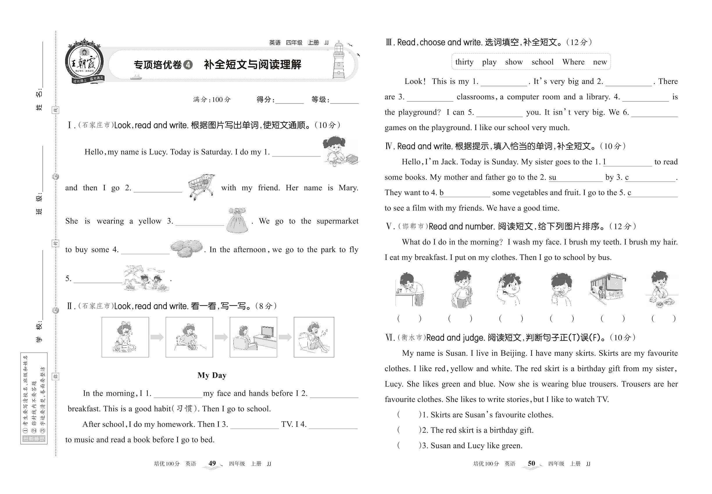 2022上册四年级英语冀教版 专项培优卷4 补全短文与阅读理解
