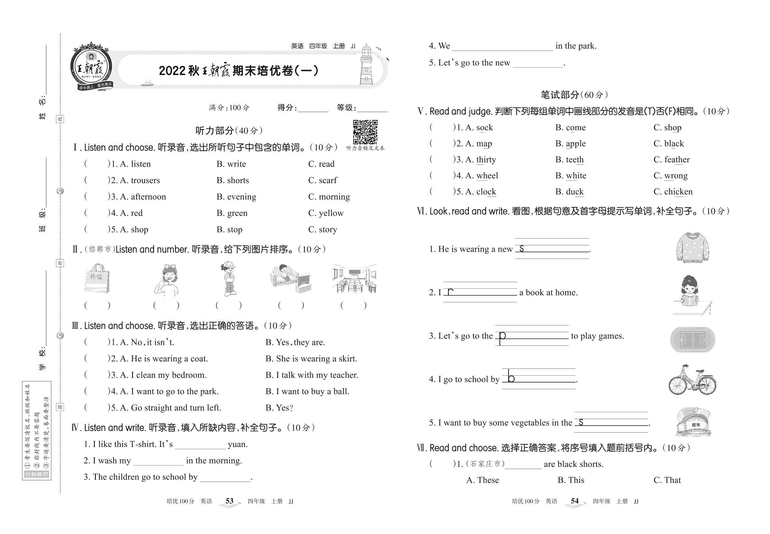 2022上册四年级英语冀教版 2022秋王朝霞期末培优卷(一)