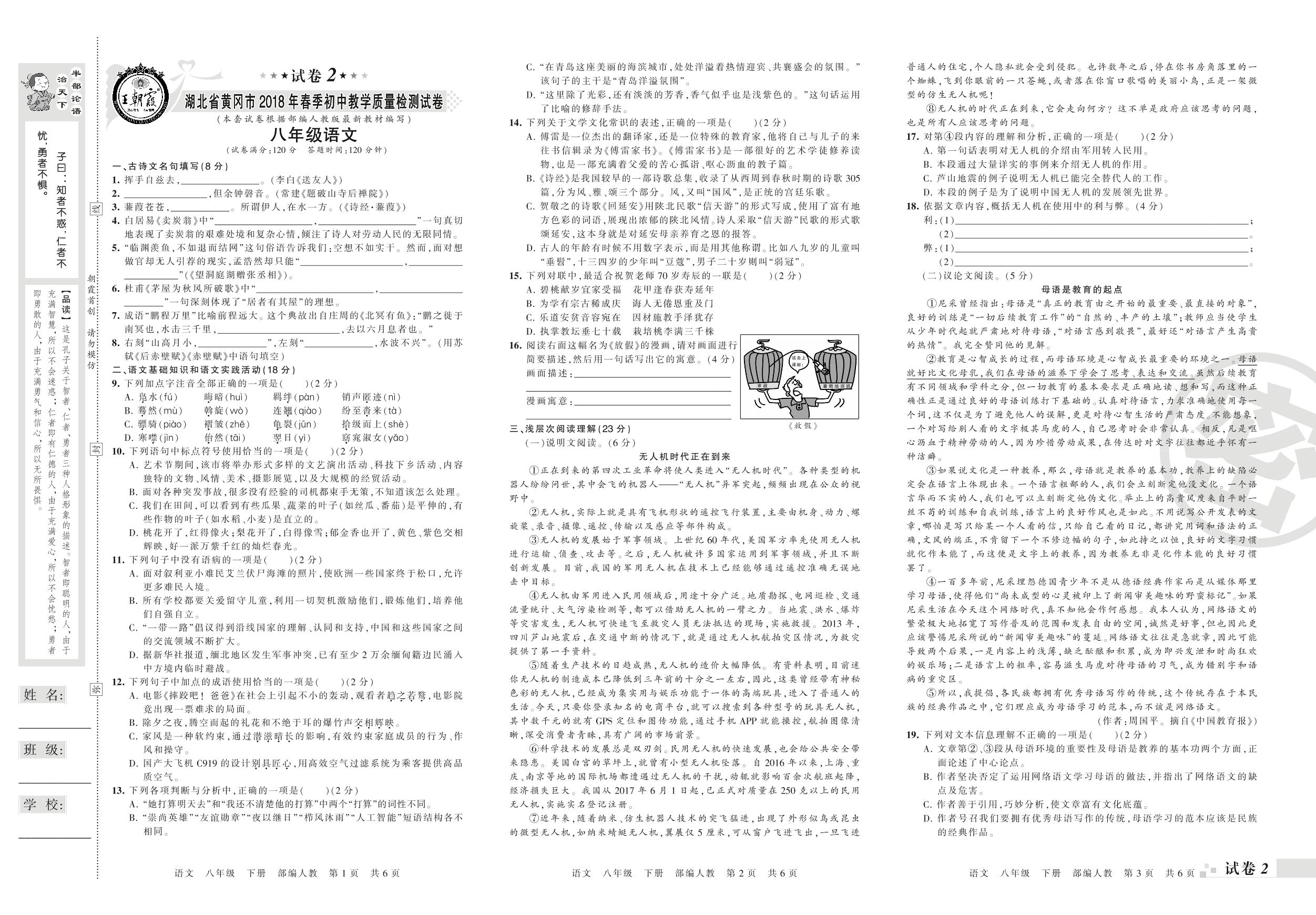 2017-2018学年第二学期湖北省黄冈市八年级语文试卷(人教版)【2】